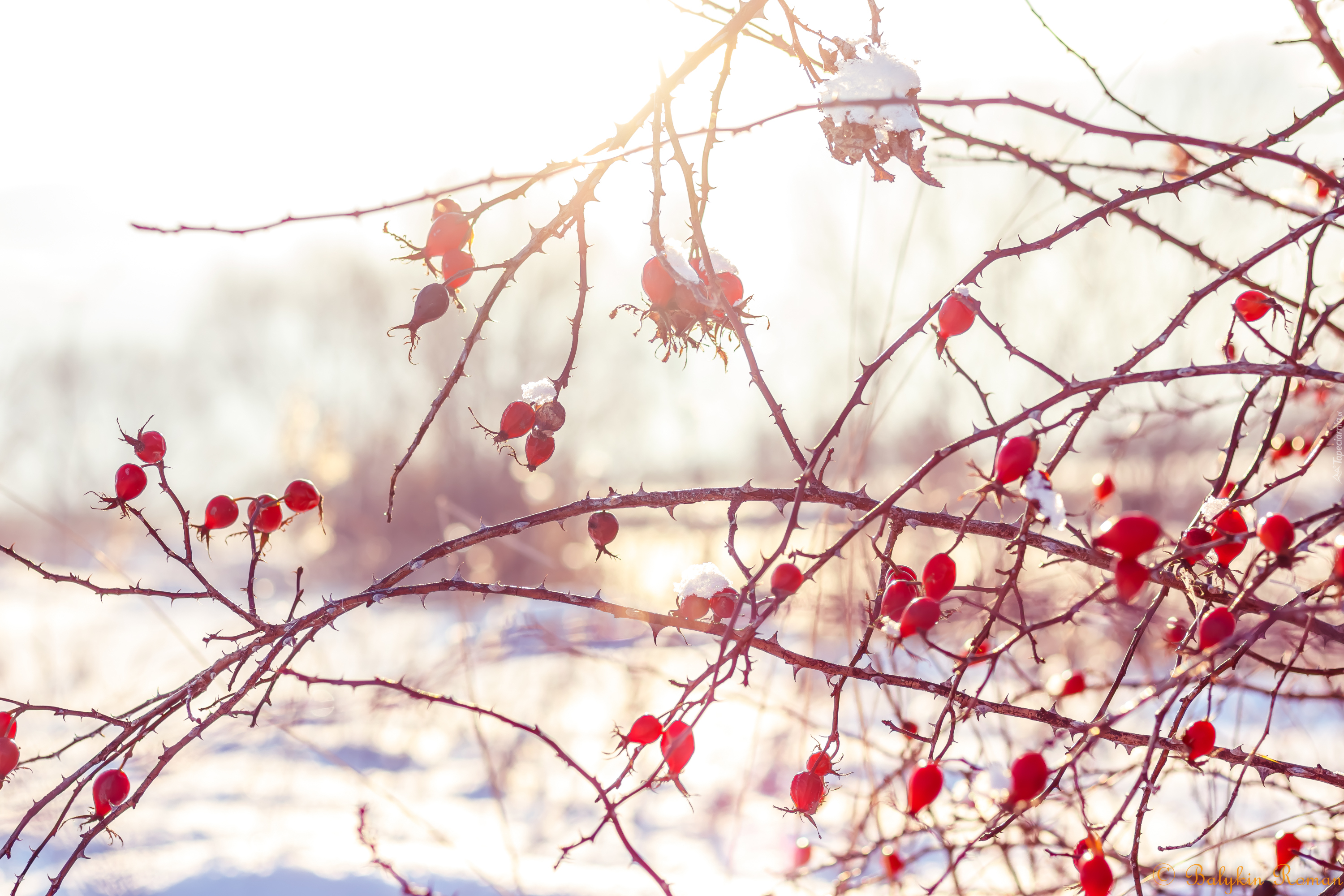 Edytor tapety: Ośnieżone owoce i gałązki dzikiej róży