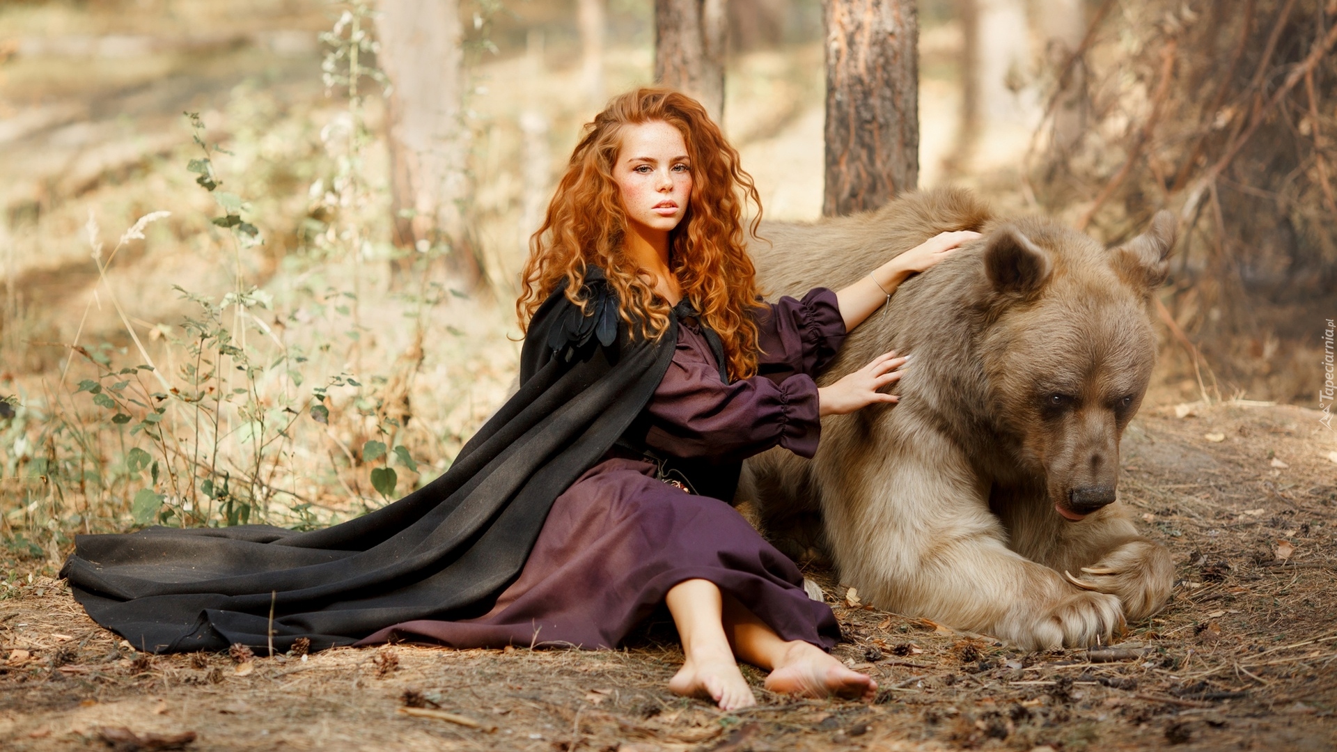 Edytor tapety: Rudowłosa dziewczyna i niedźwiedź