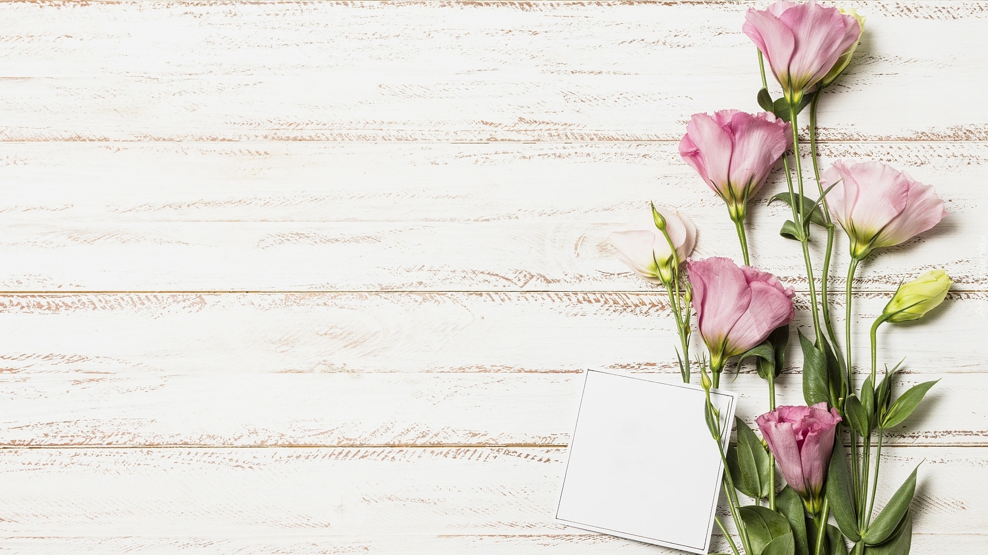 Edytor tapety: Karteczka i kwiaty eustomy na deskach