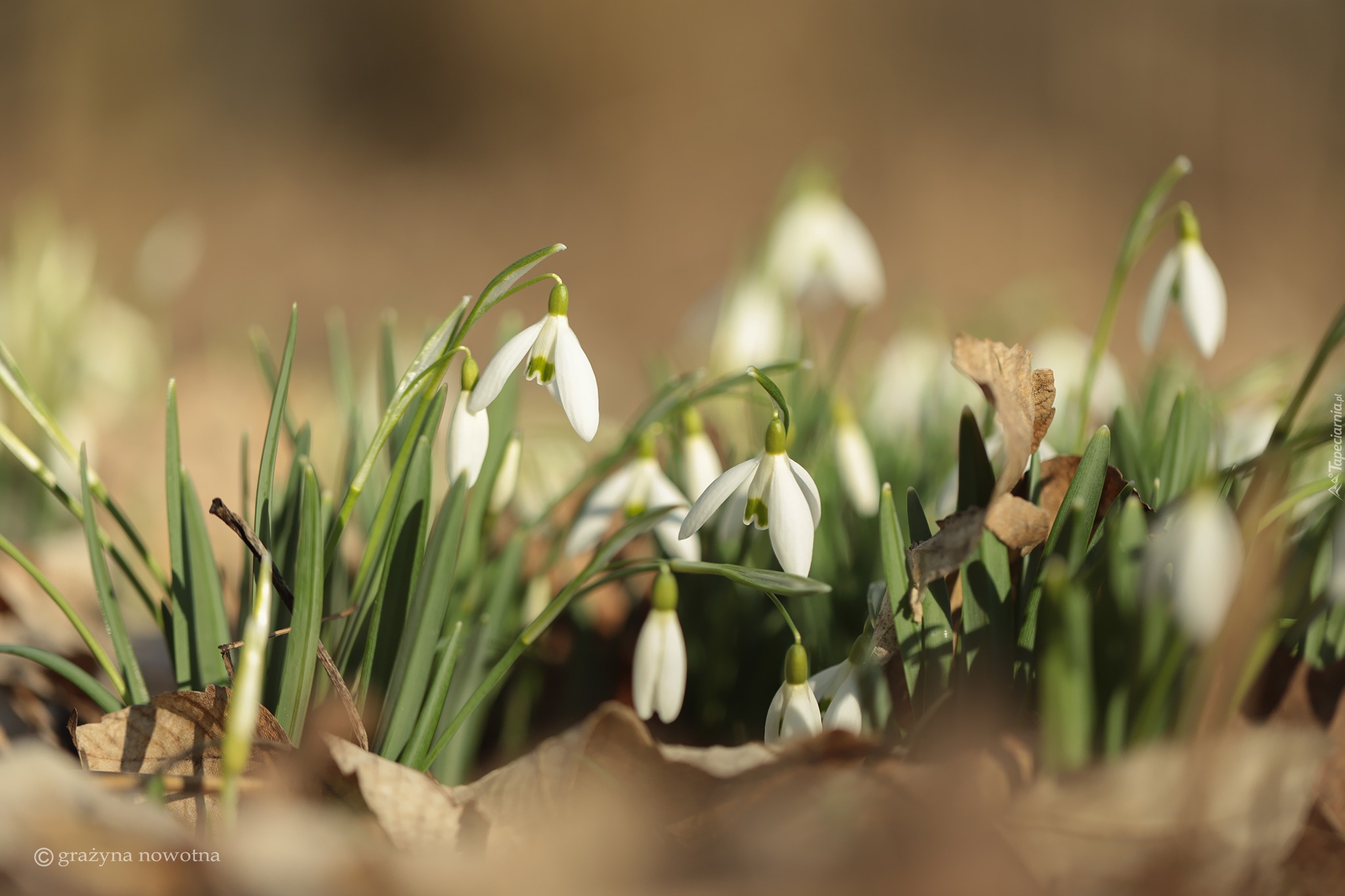 Edytor tapety: Pochylone przebiśniegi na rozmytym tle