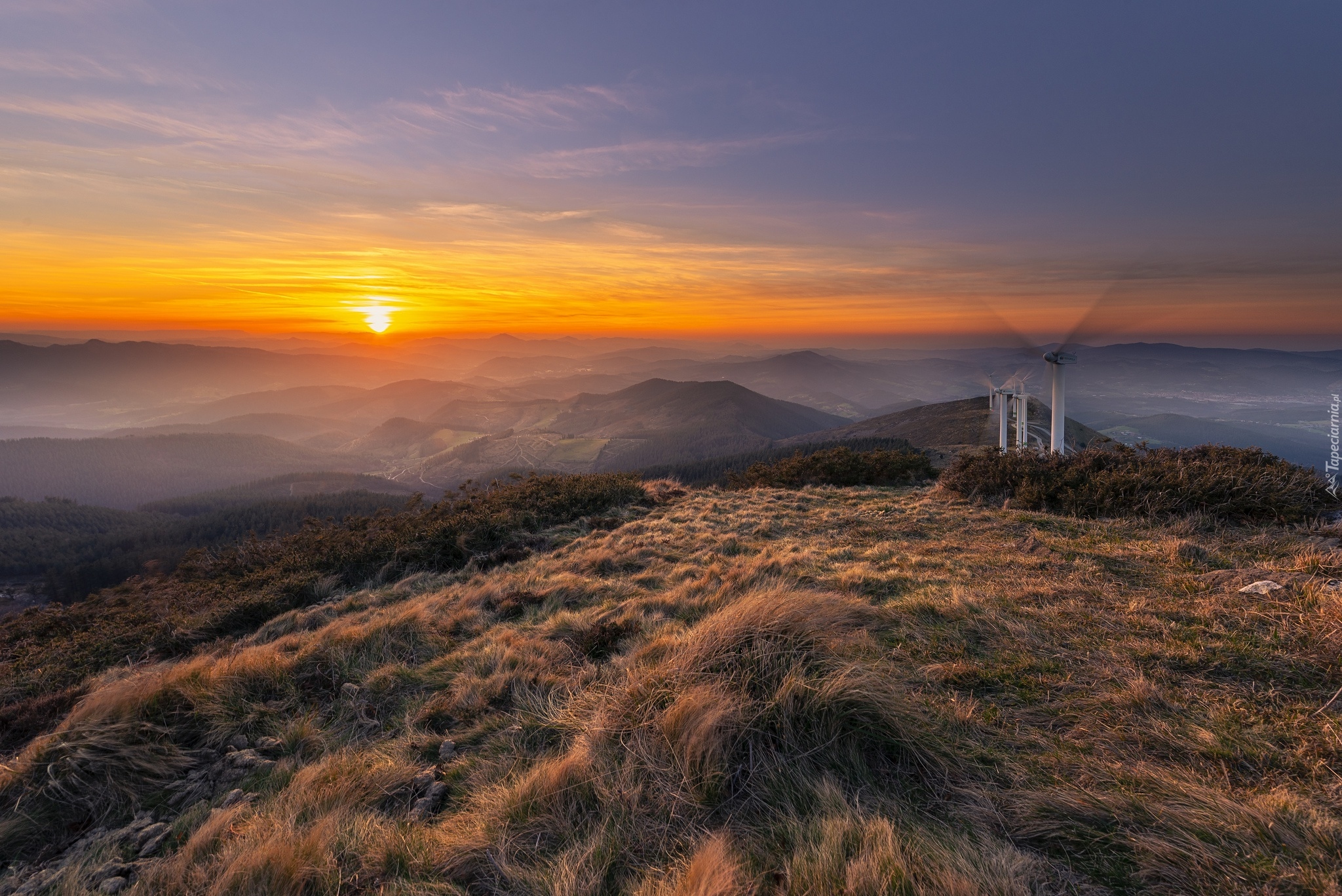 Edytor tapety: Wiatraki na tle zachodu słońca nad górami