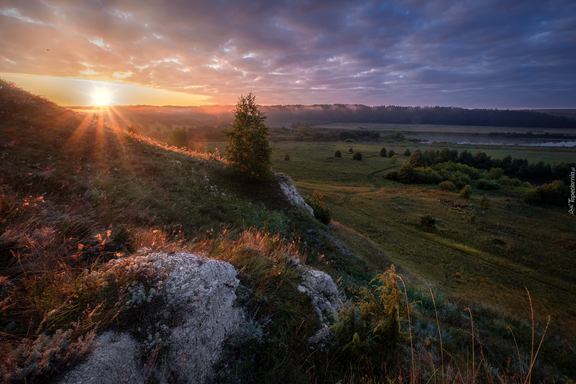 Edytor tapety: Drzewo na wzgórzu w promieniach słońca