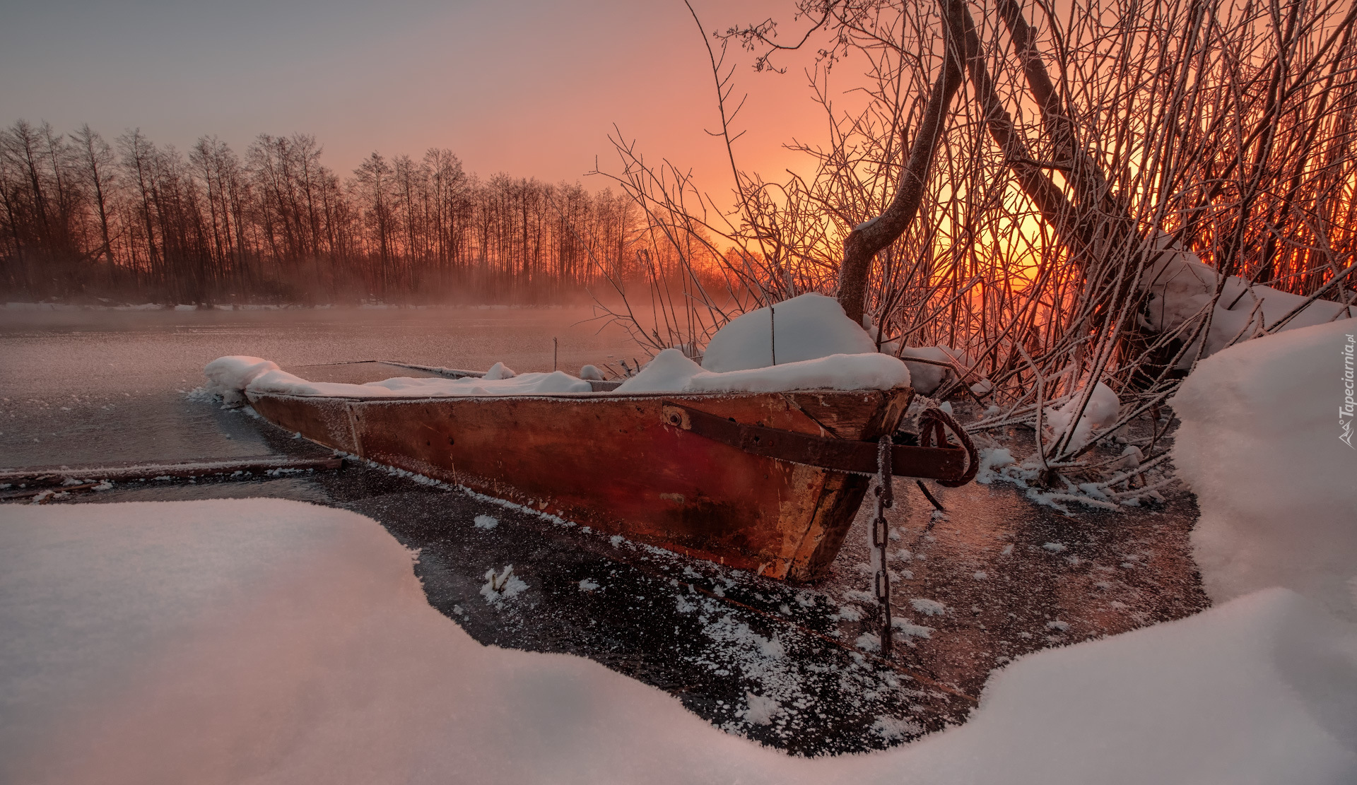 Edytor tapety: Łódka przycumowana przy brzegu jeziora pod drzewami