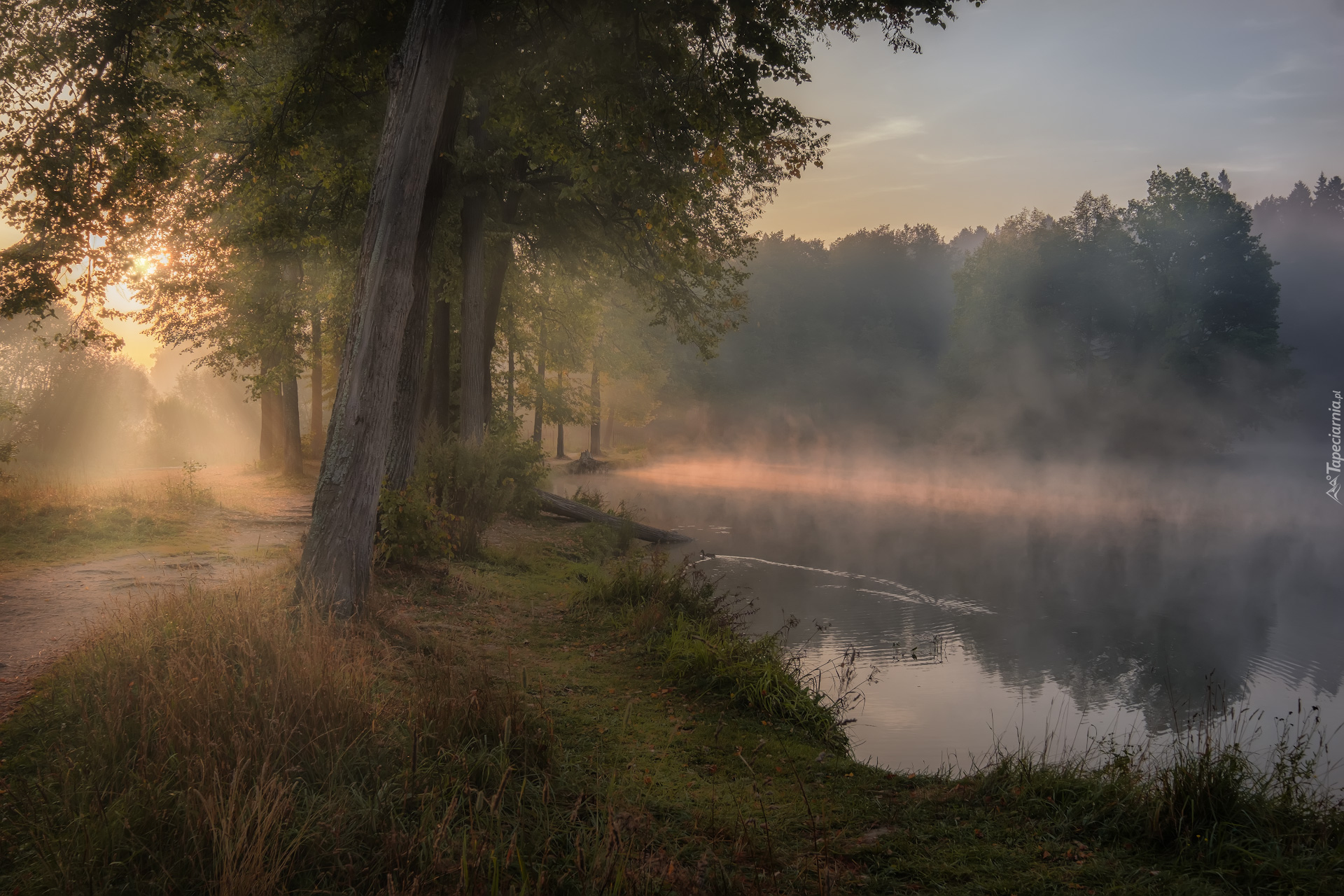 Edytor tapety: Drzewa nad zamglonym stawem Barskim