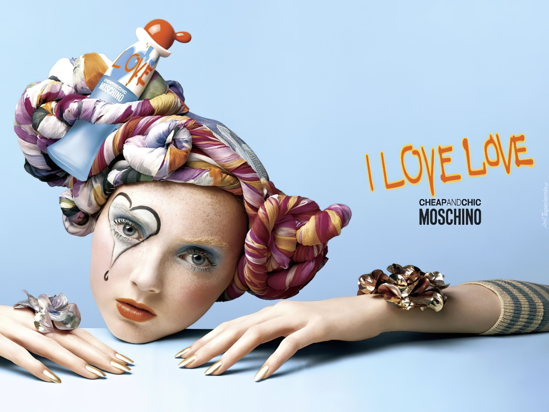 Edytor tapety: Moschino, kobieta, turban, perfumy