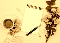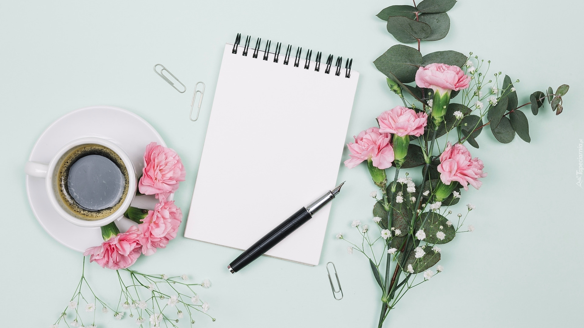 Edytor tapety: Kawa w filiżance i bukiet goździków obok notesu