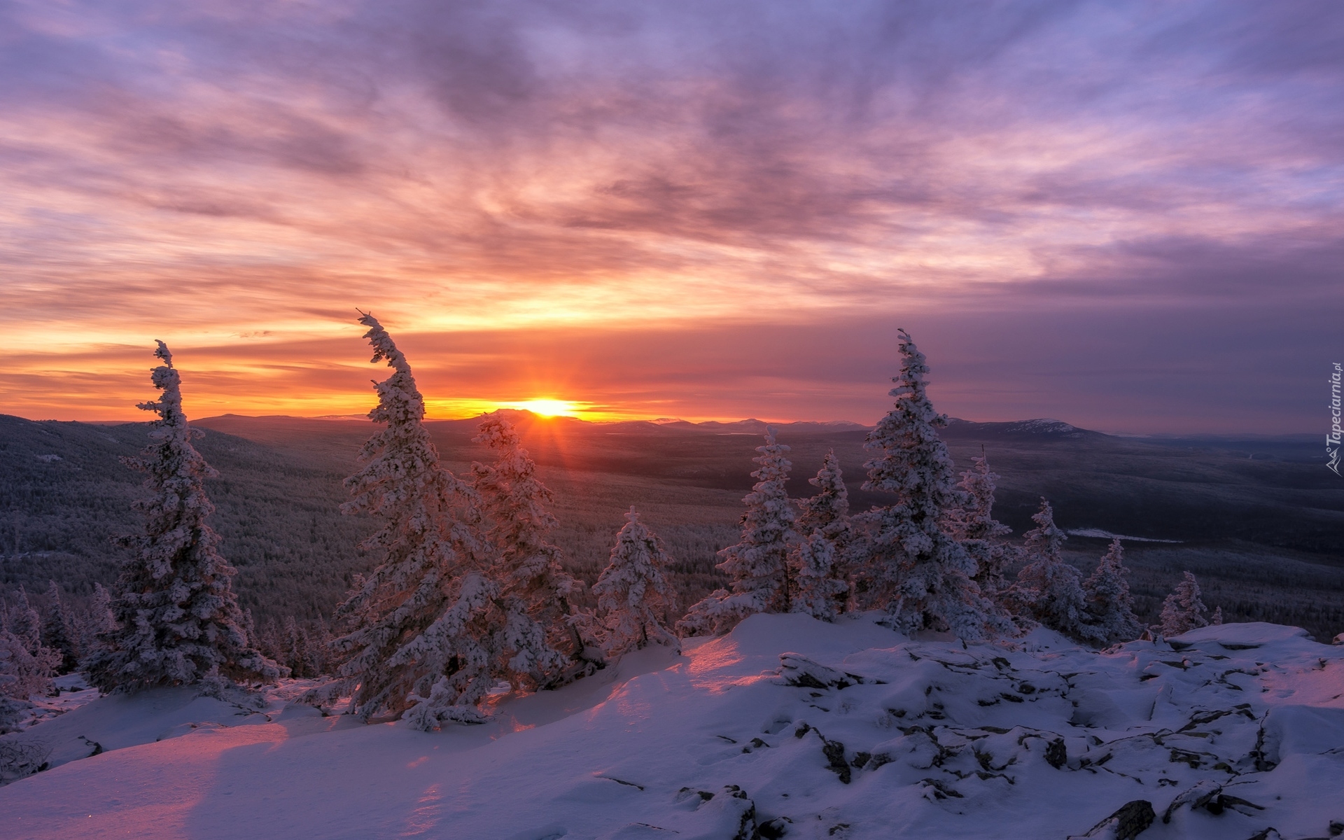 Edytor tapety: Ośnieżone drzewa na wzgórzu w promieniach zachodzącego słońca
