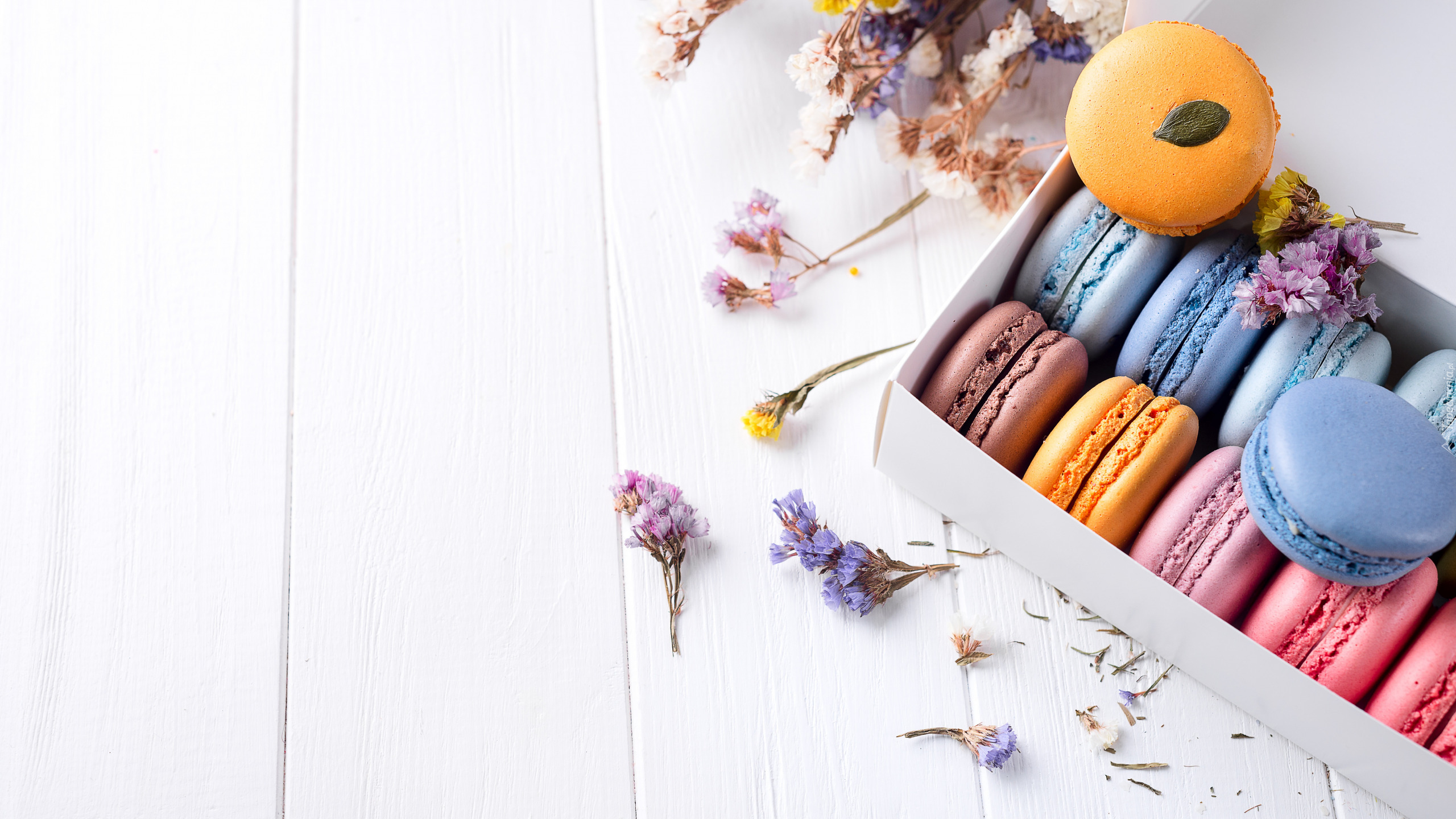 Edytor tapety: Suszone kwiatki wokół pudełka z makaronikami