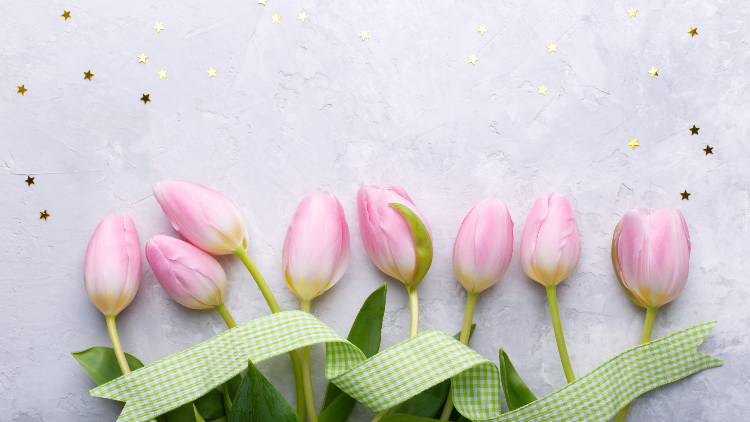 Edytor tapety: Bladoróżowe tulipany i zielona wstążka
