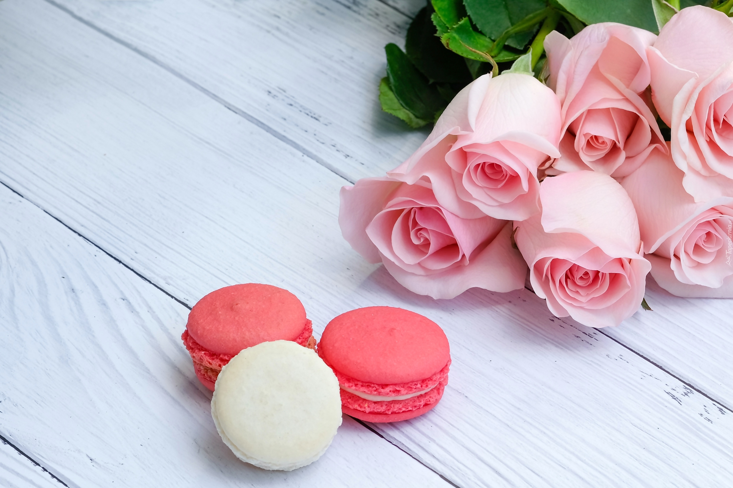 Edytor tapety: Trzy makaroniki obok róż