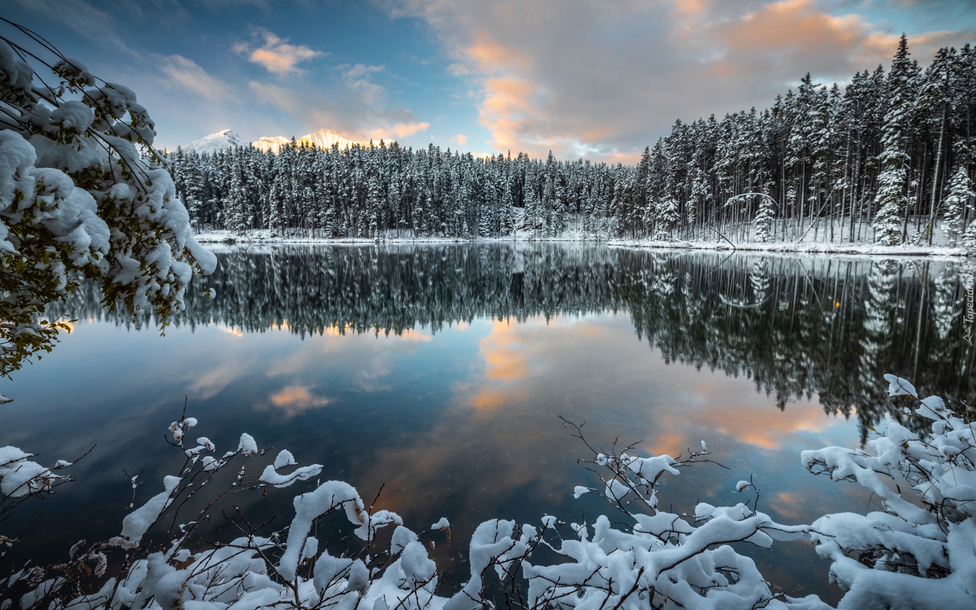 Edytor tapety: Jezioro w ośnieżonym lesie
