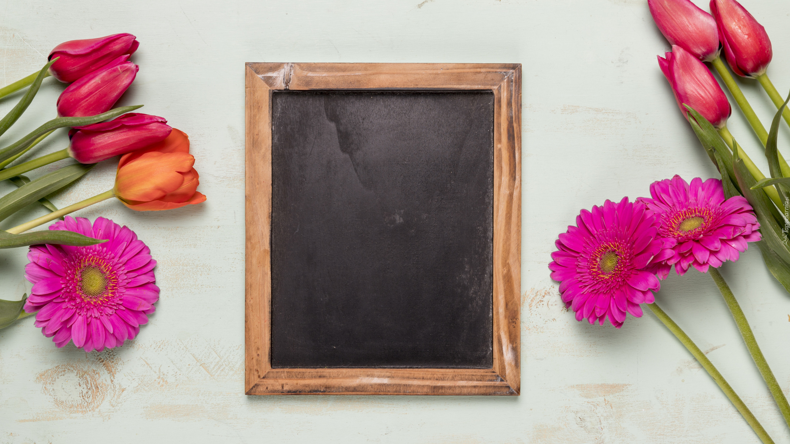 Edytor tapety: Tulipany i gerbery położone obok tabliczki