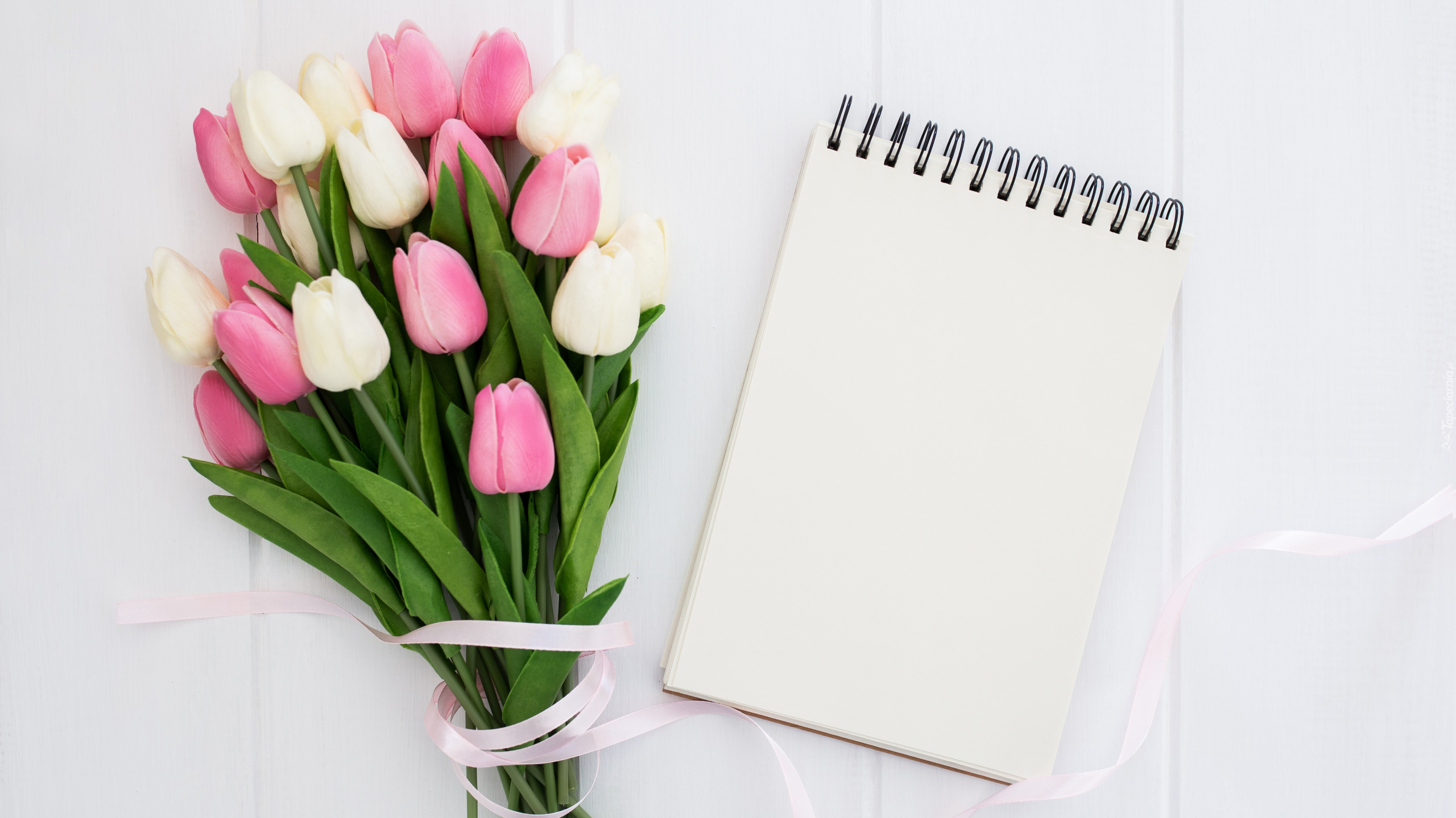 Edytor tapety: Różowe i białe tulipany obok notesu
