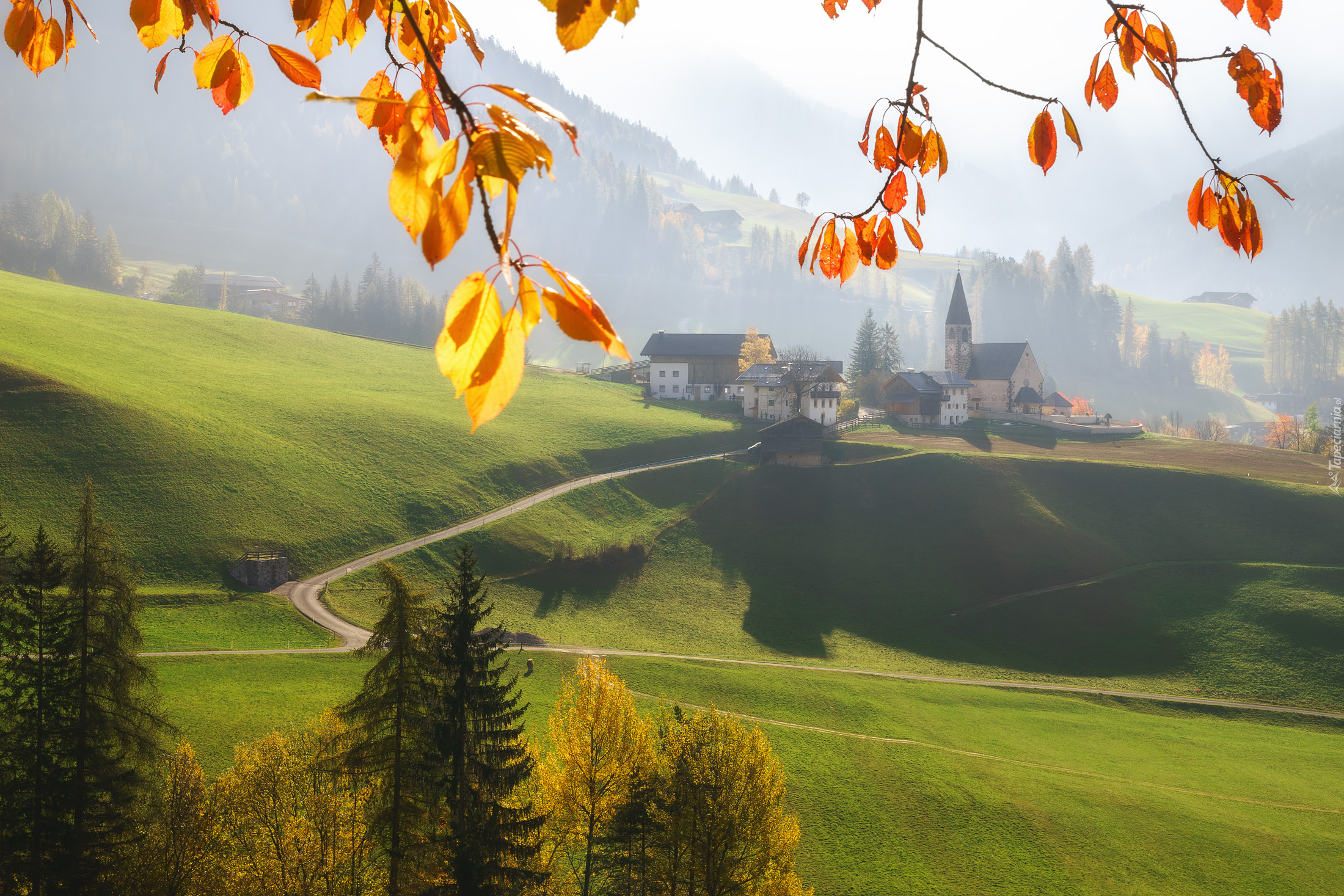 Edytor tapety: Domy przy kościele we włoskiej wsi Santa Maddalena