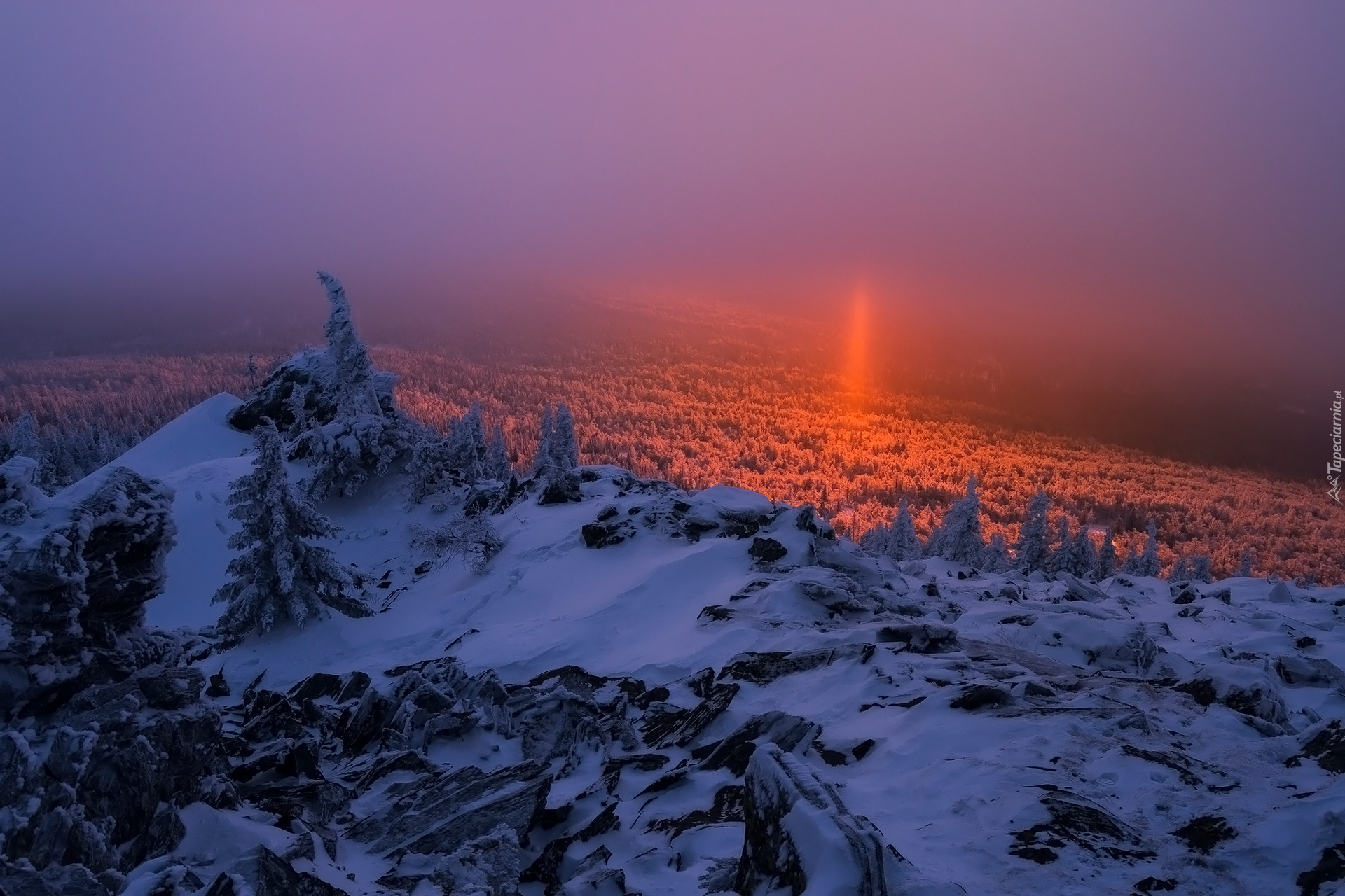 Edytor tapety: Słońce zachodzi za zamglone góry