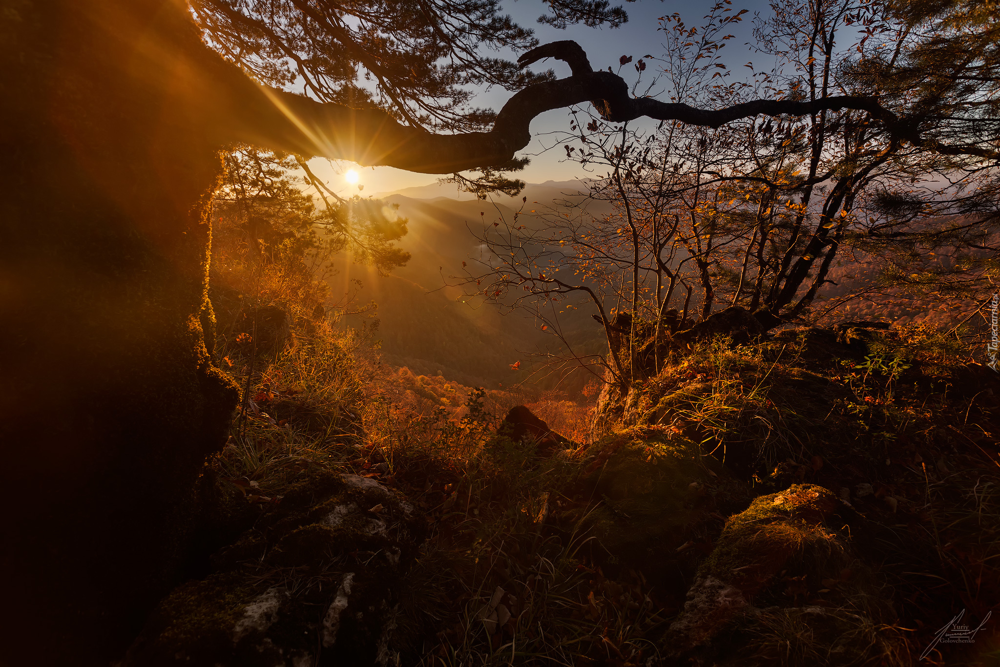 Edytor tapety: Gałęzie drzewa i krzewu w promieniach słońca
