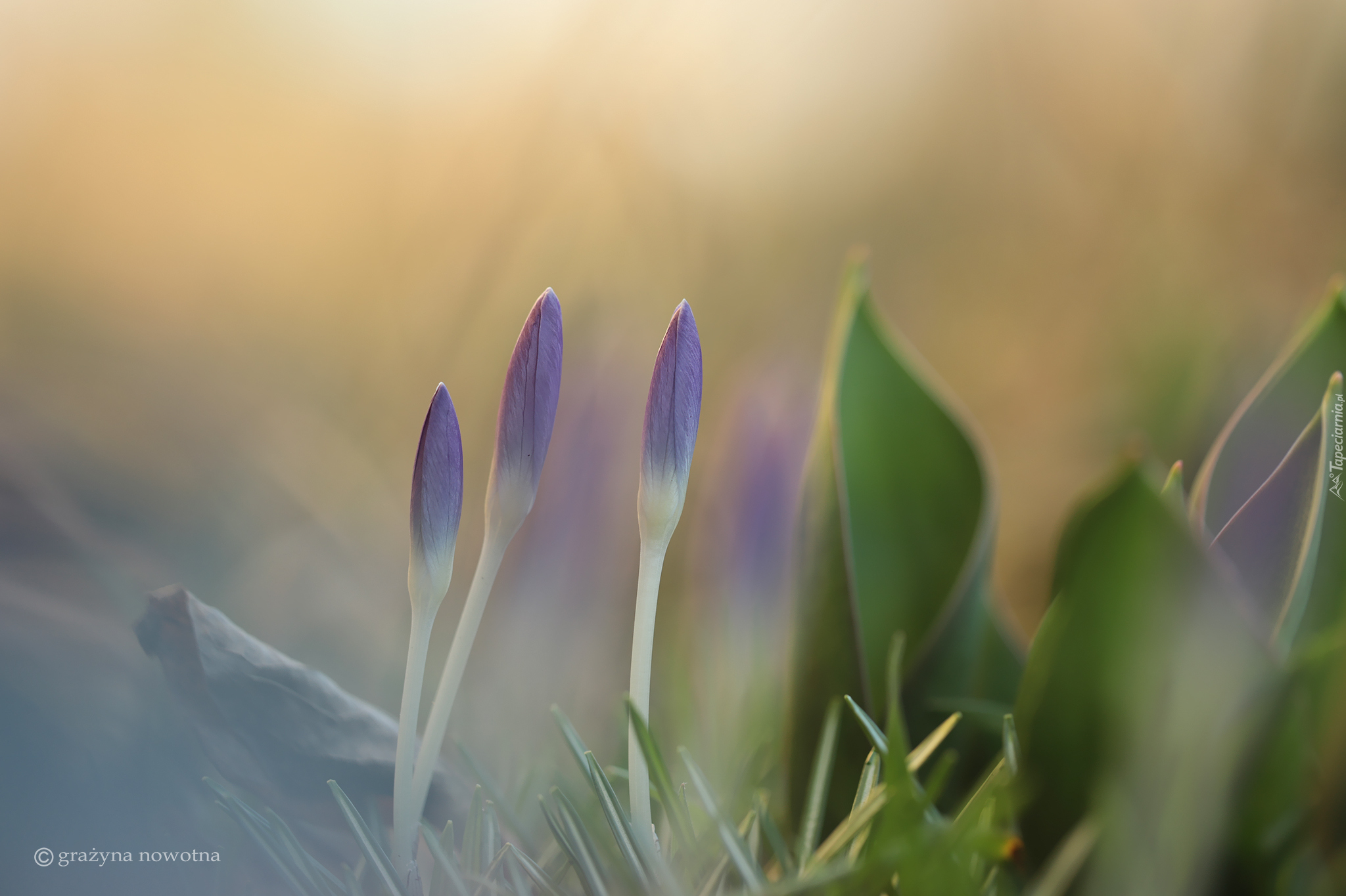 Edytor tapety: Pąki krokusów i liście w rozmyciu