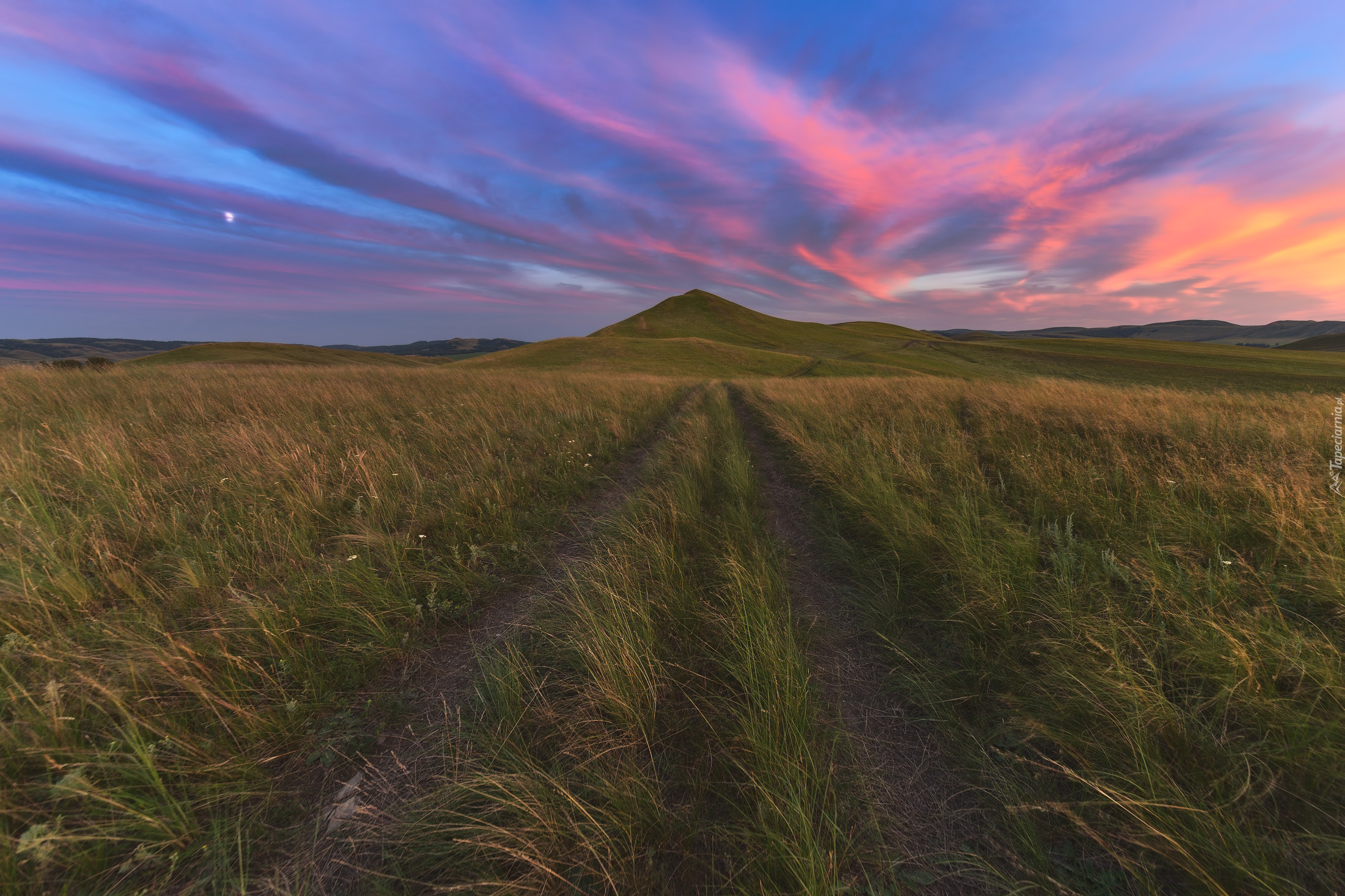 Edytor tapety: Droga pośród łąk na tle wzgórz