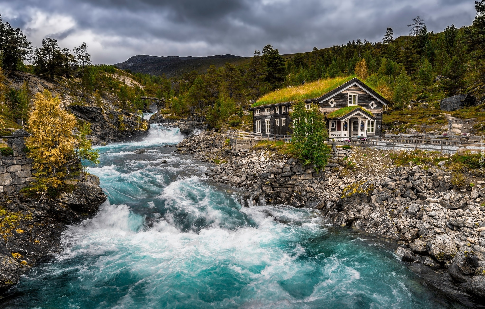 Edytor tapety: Drewniany przy rzece Tora w norweskiej miejscowości Skjak