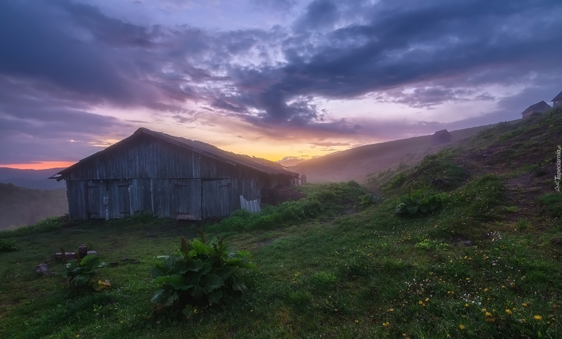 Edytor tapety: Szopa na zielonym wzgórzu