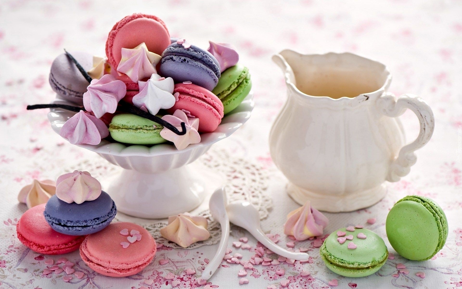 Edytor tapety: Makaroniki i bezy na paterze obok dzbanuszka