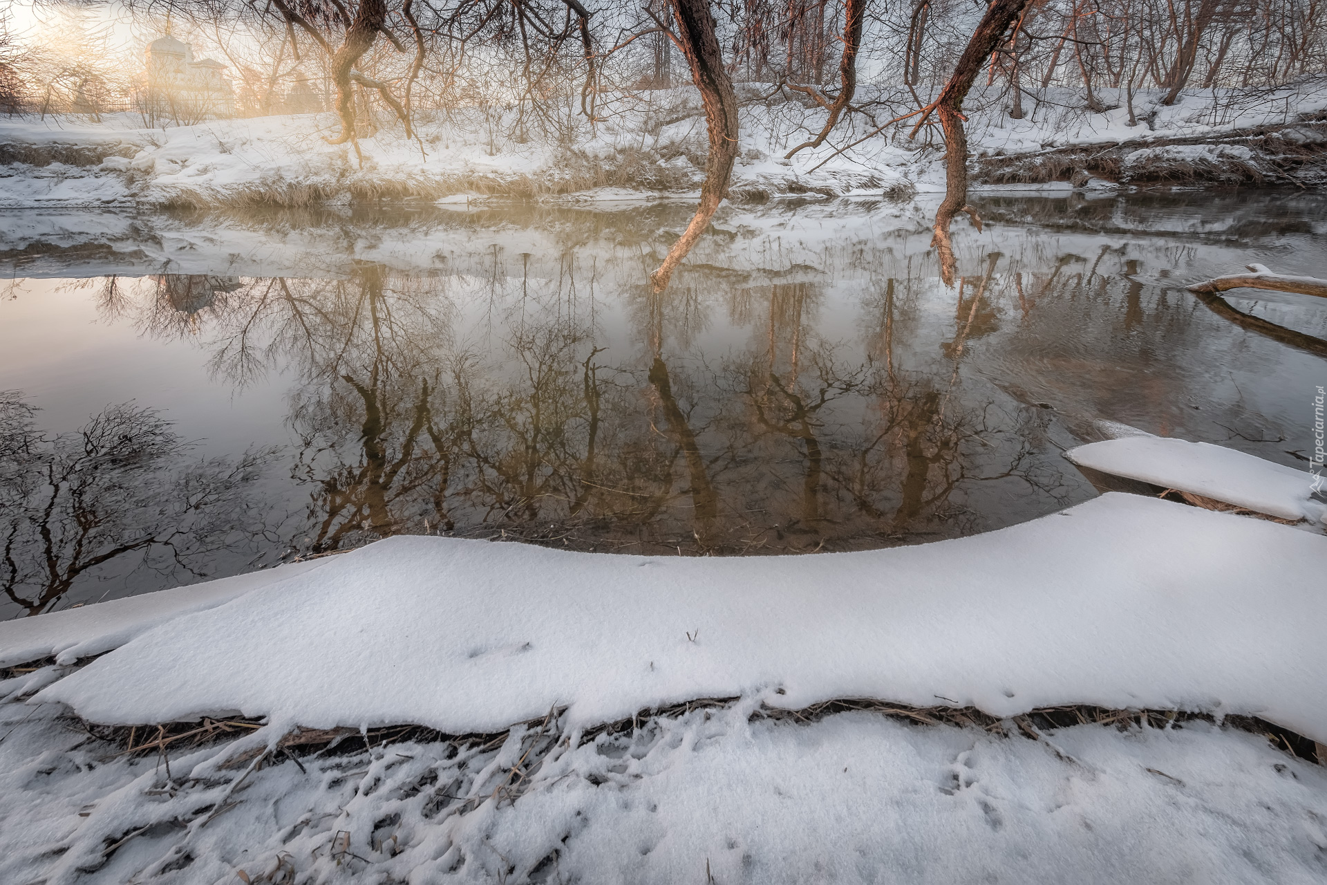 Edytor tapety: Odbicie drzew w rzece zimową porą