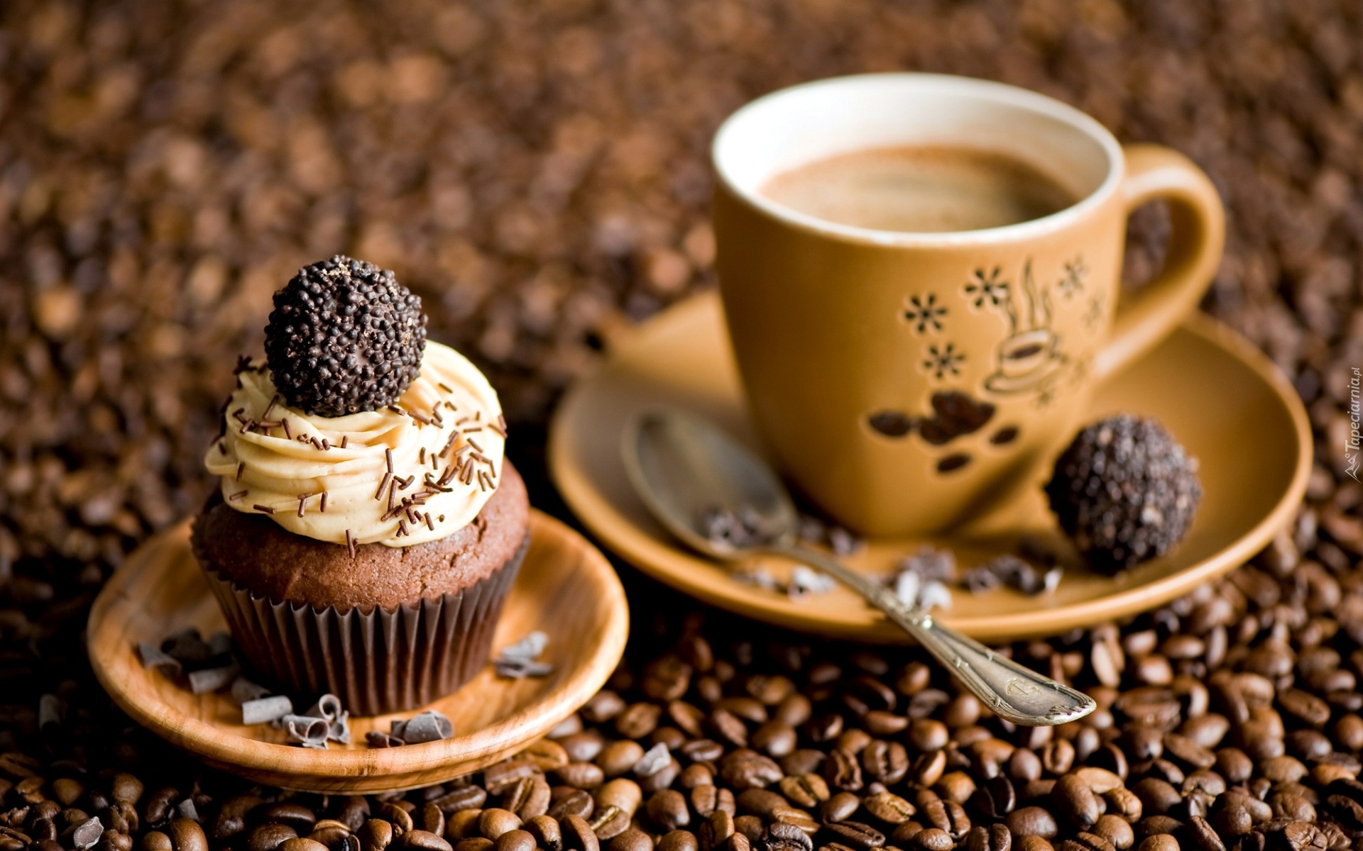 Edytor tapety: Babeczka obok filiżanki na ziarnach kawy