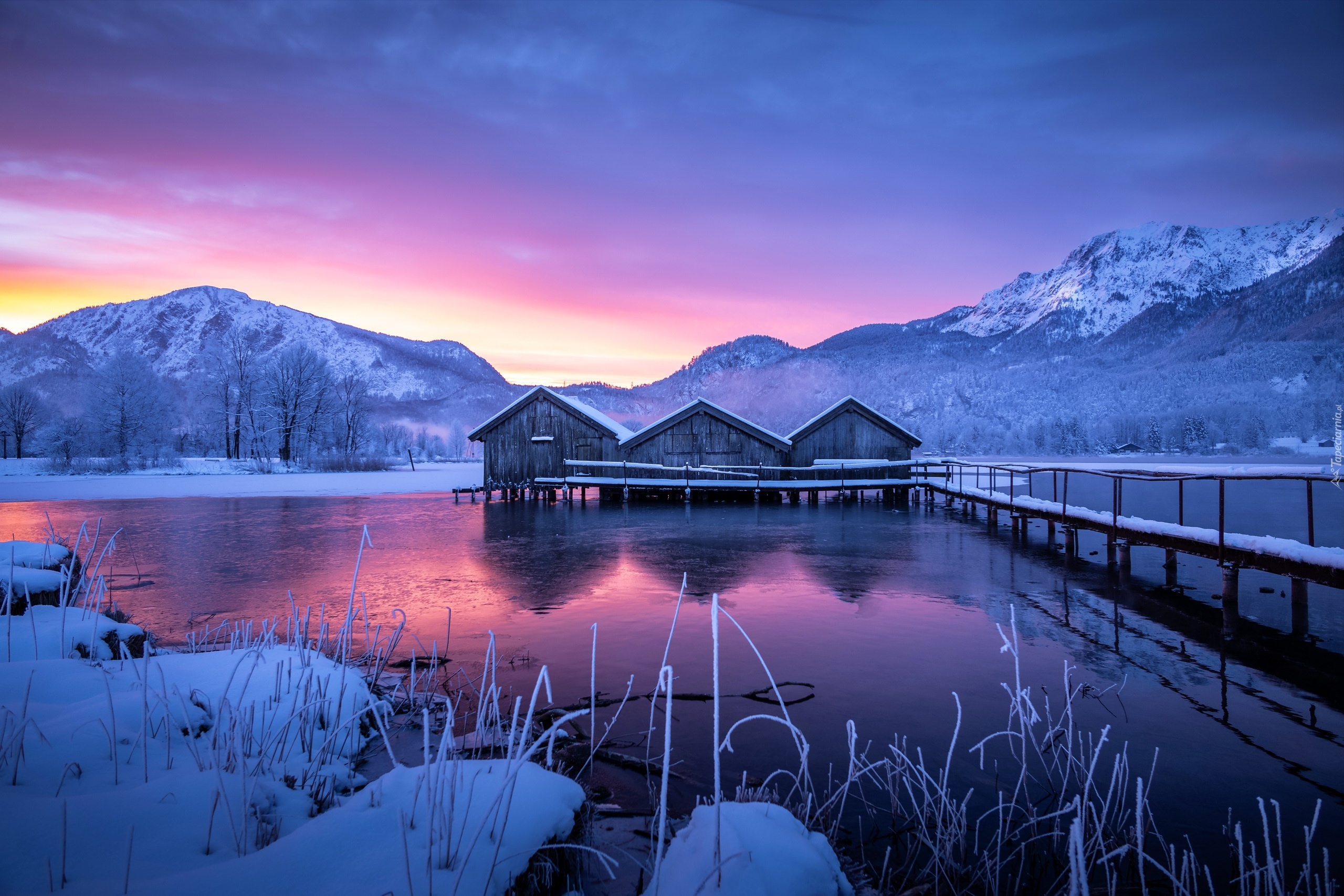 Edytor tapety: Domki na niemieckim jeziorze Kochelsee zimową porą
