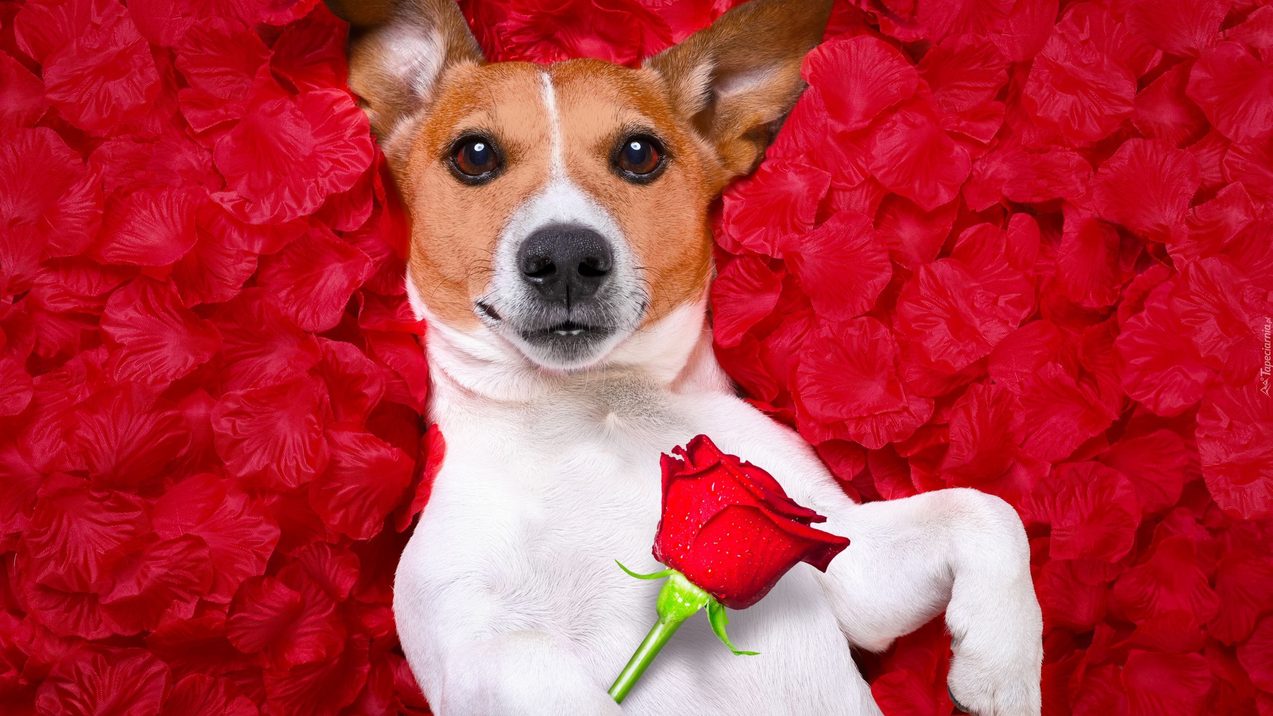 Edytor tapety: Jack Russell terrier z czerwoną różą