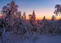 Edytor tapety: Drzewa przysypane śniegiem w blasku zachodzącego słońca