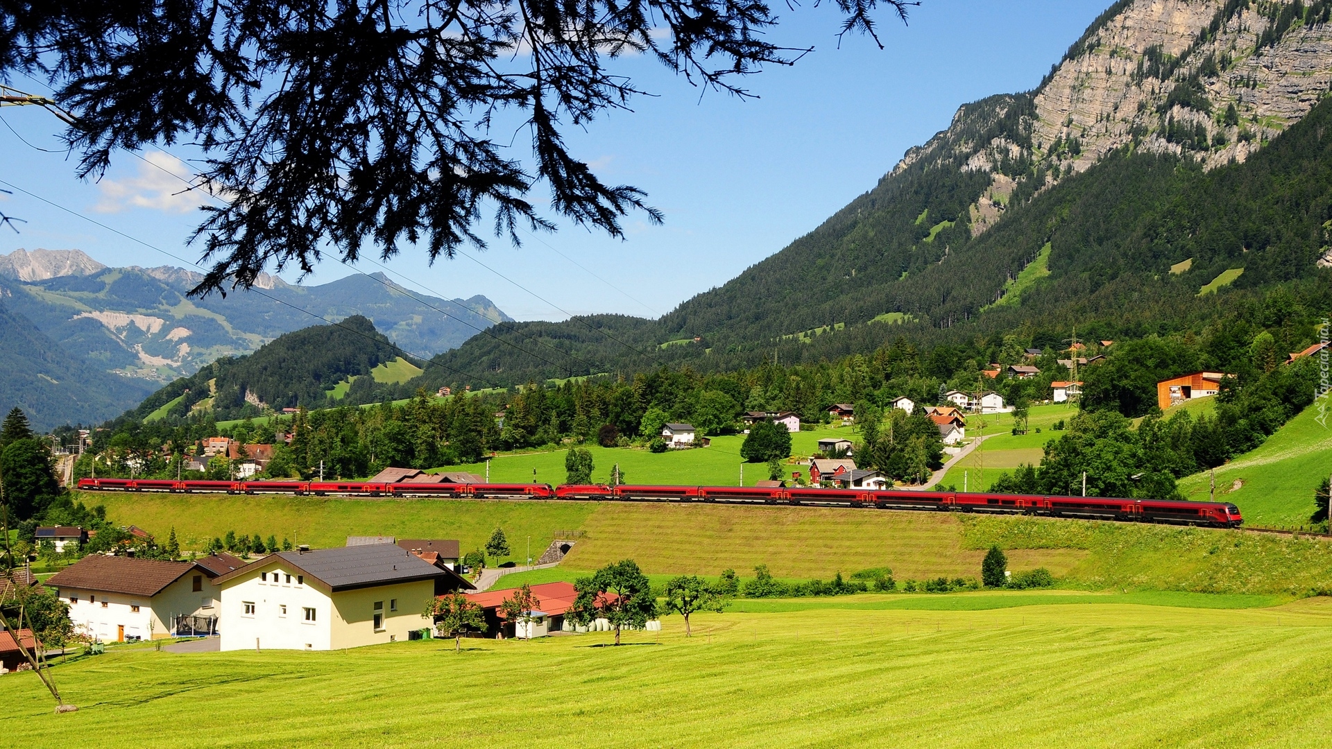 Edytor tapety: Pociąg przejeżdżający przez górskie miasteczko