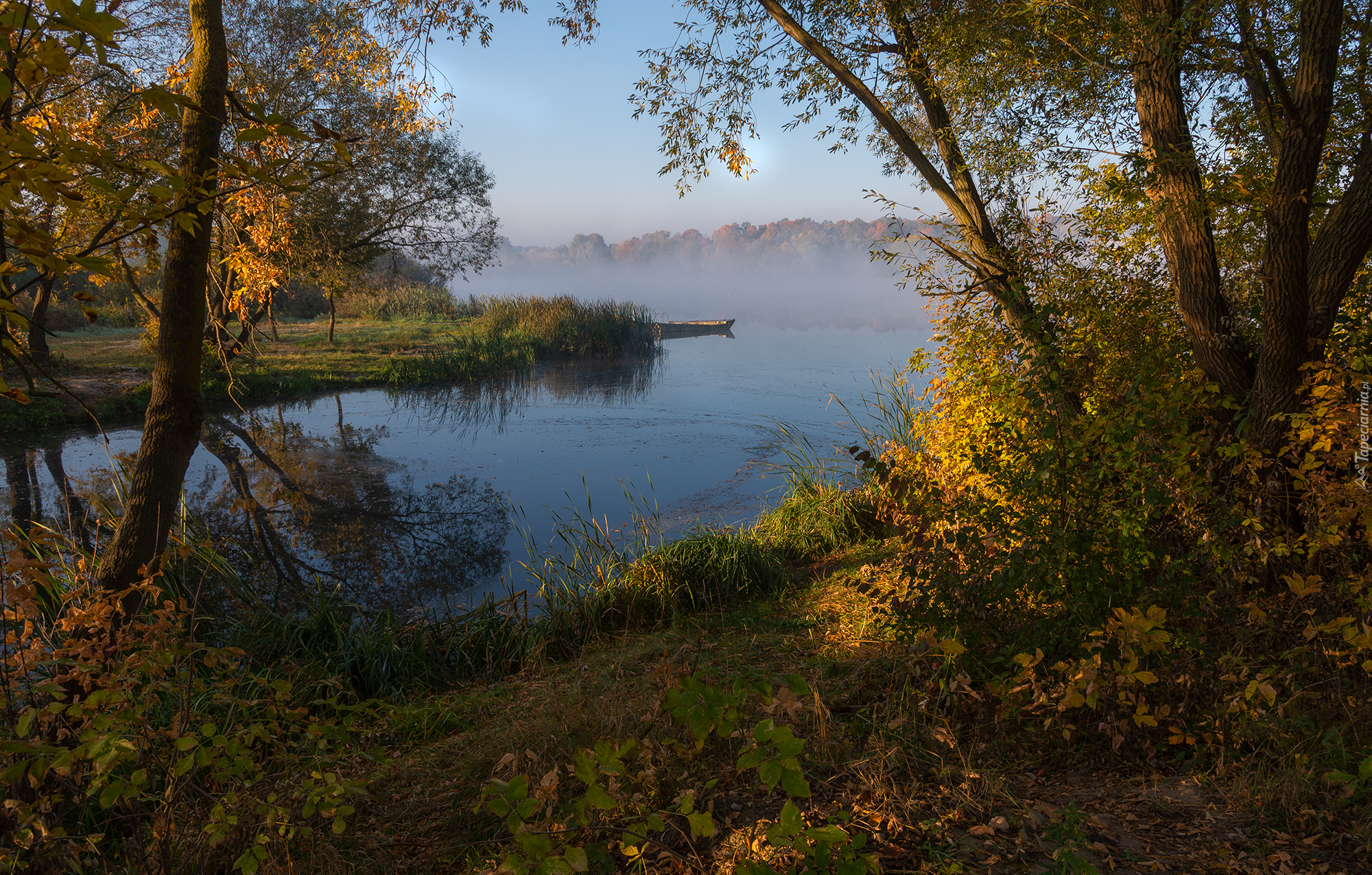 Edytor tapety: Drzewa i rośliny nad zamglonym jeziorem