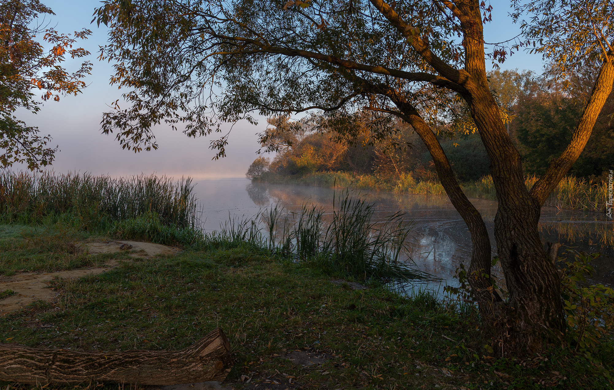 Edytor tapety: Trzciny i drzewa na brzegu jeziora