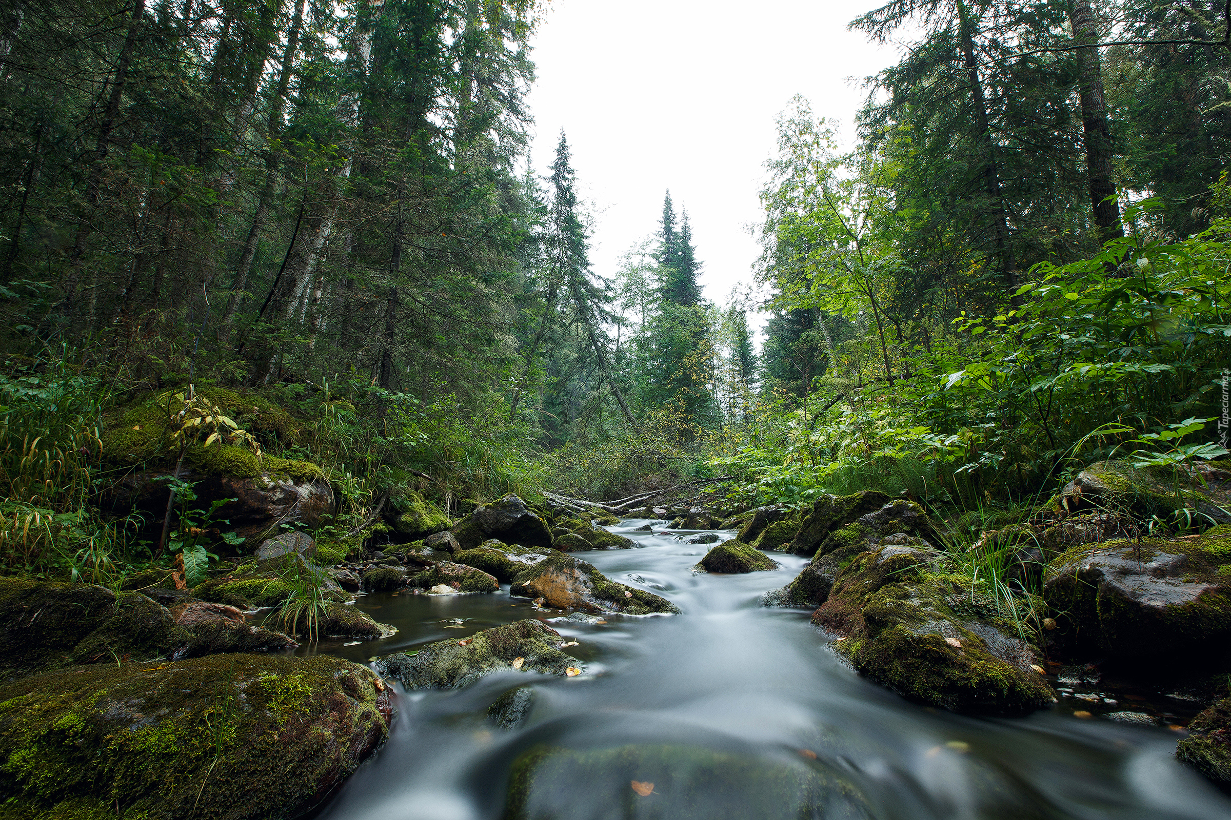 Edytor tapety: Omszałe kamienie i rośliny nad rzeką w lesie