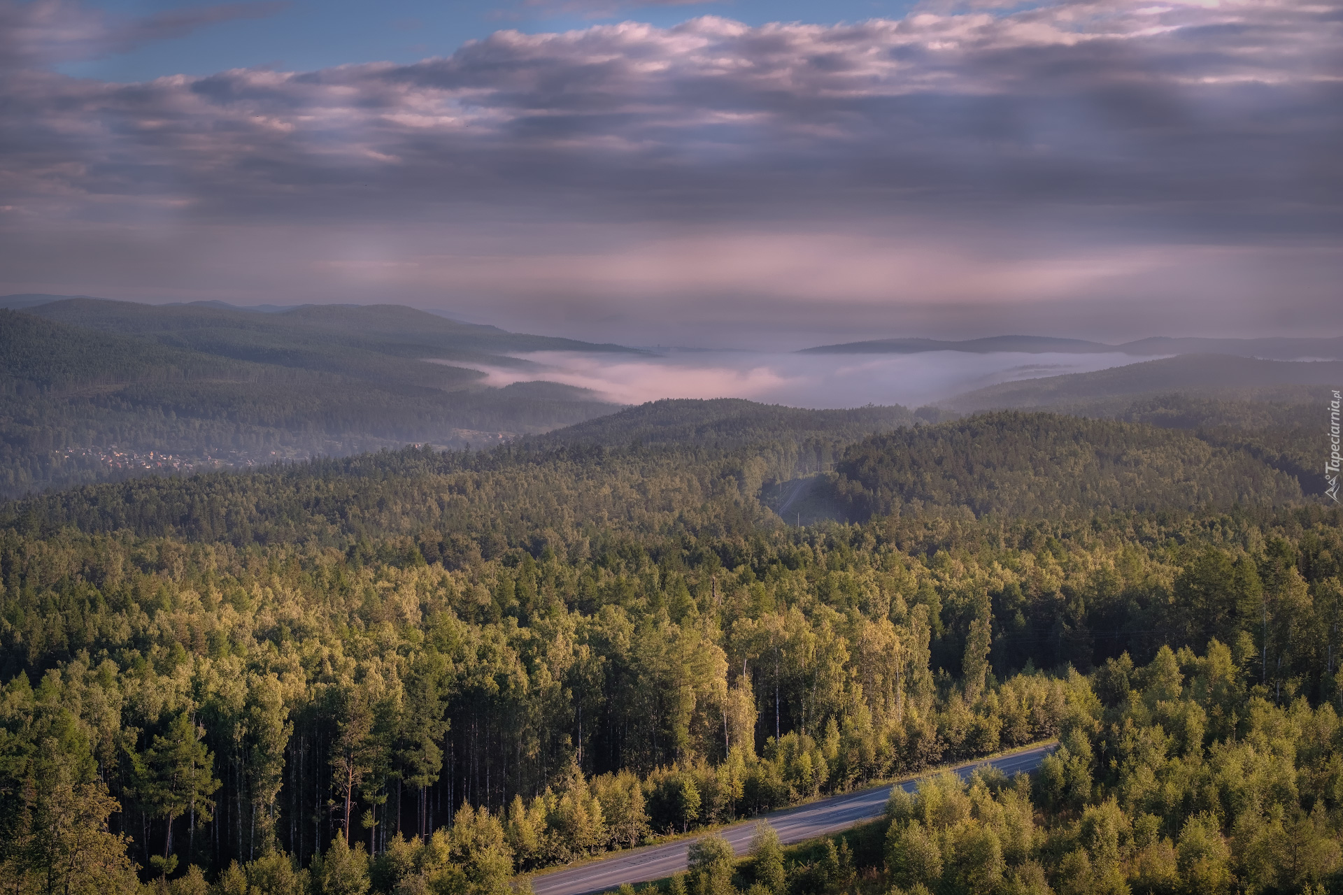 Edytor tapety: Zalesione wzgórza we mgle