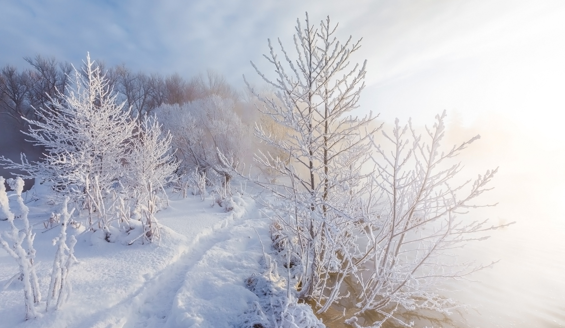 Edytor tapety: Dróżka w śniegu nad zamgloną rzeką