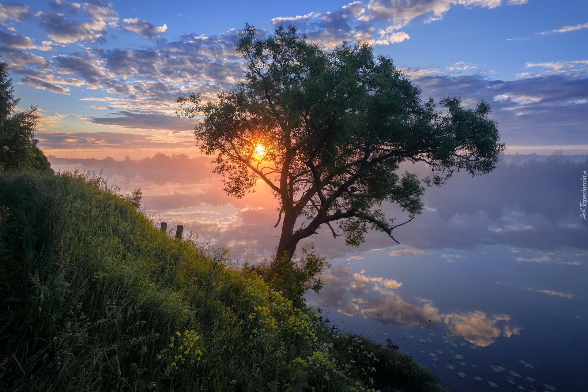 Edytor tapety: Drzewo nad rzeką w blasku wschodzącego słońca