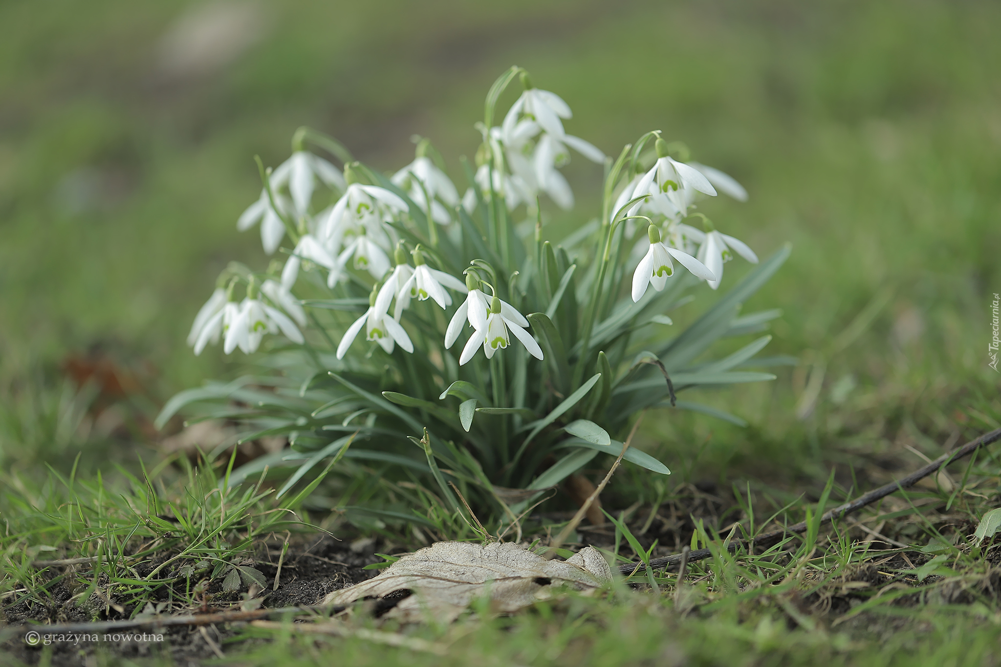 Edytor tapety: Kępka białych przebiśniegów w trawie