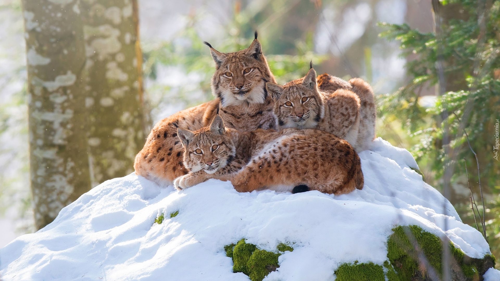 Edytor tapety: Trzy rysie na ośnieżonej skarpie