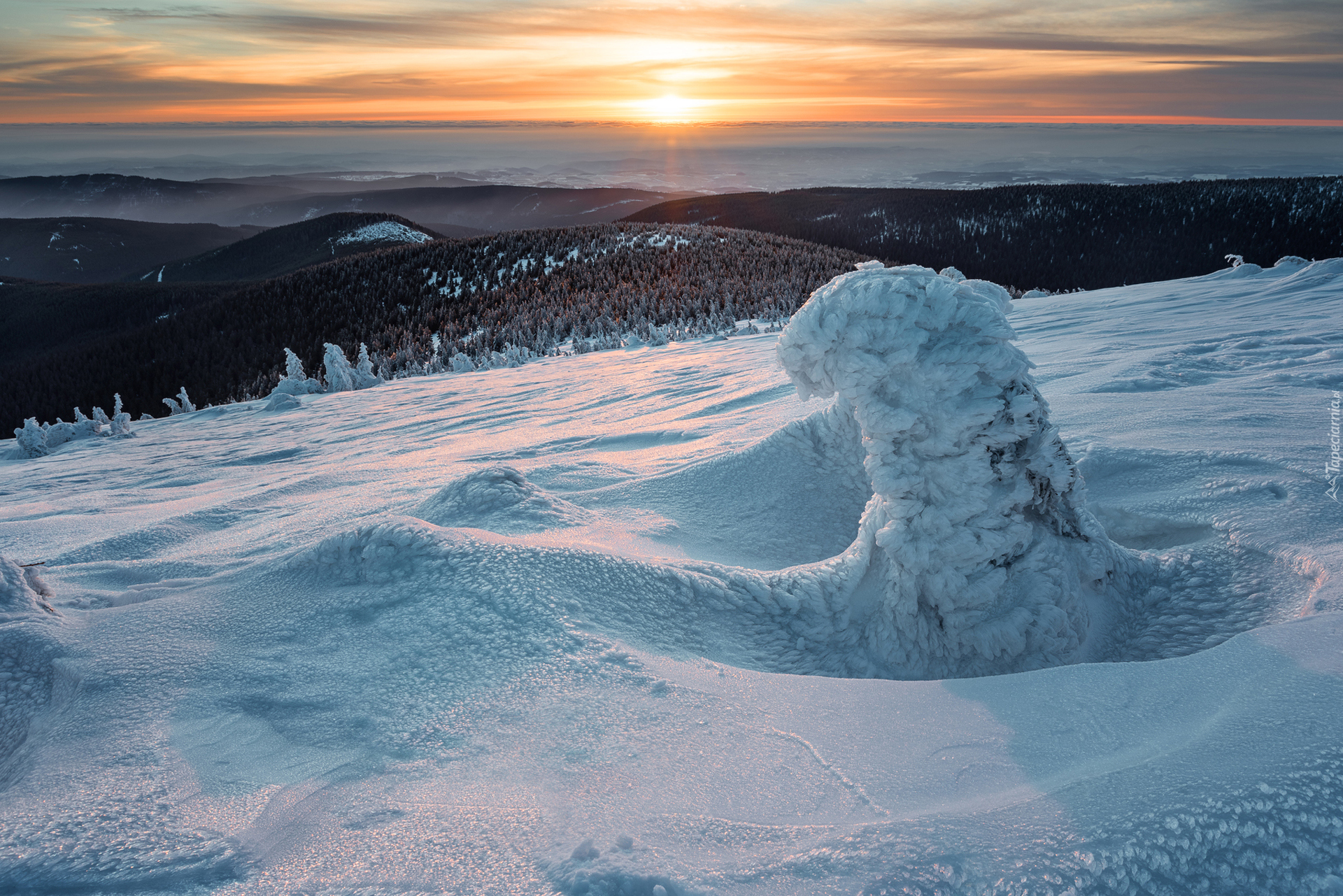 Edytor tapety: Zaśnieżone drzewo na tle gór o zachodzie słońca