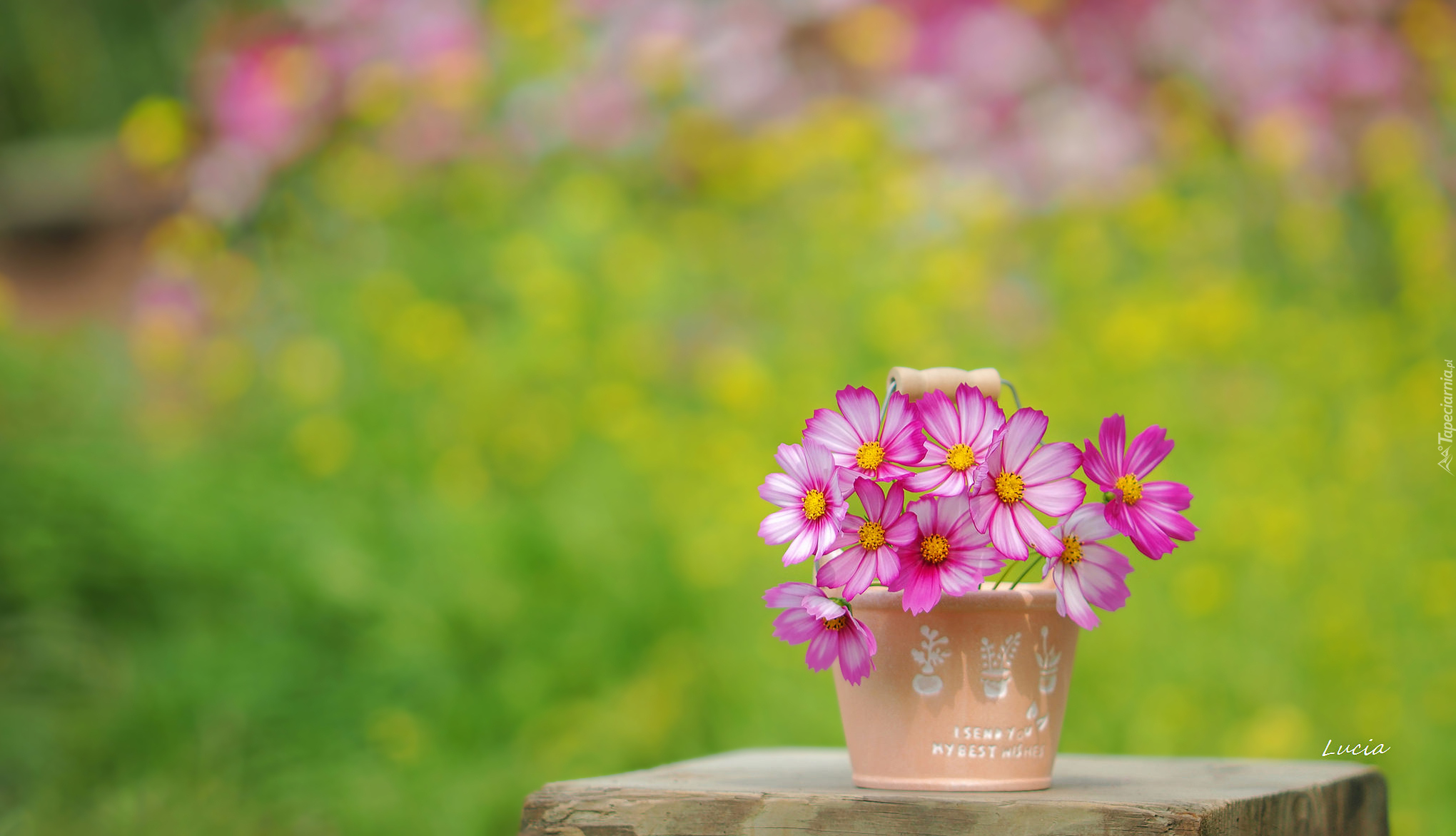 Edytor tapety: Różowa kosmea w wazoniku