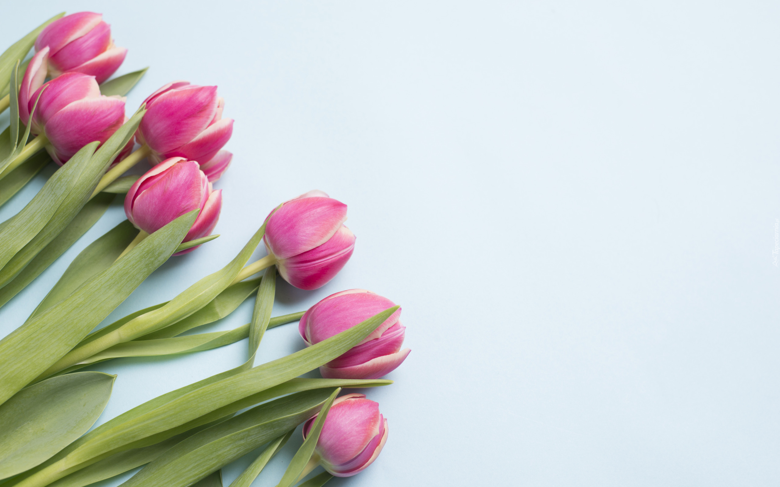 Edytor tapety: Różowe tulipany na niebieskim tle