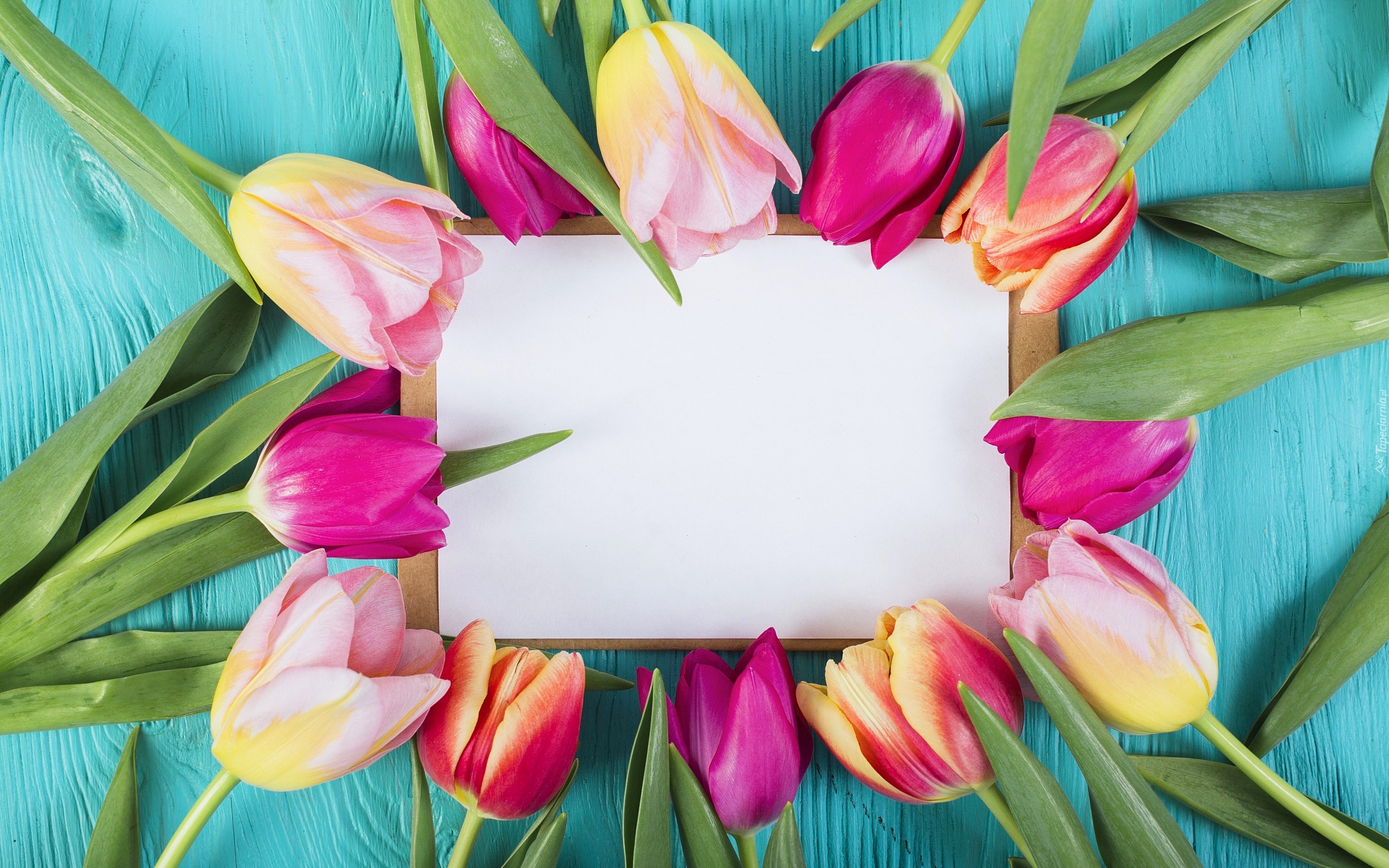 Edytor tapety: Kolorowe tulipany ułożone wokół kartki