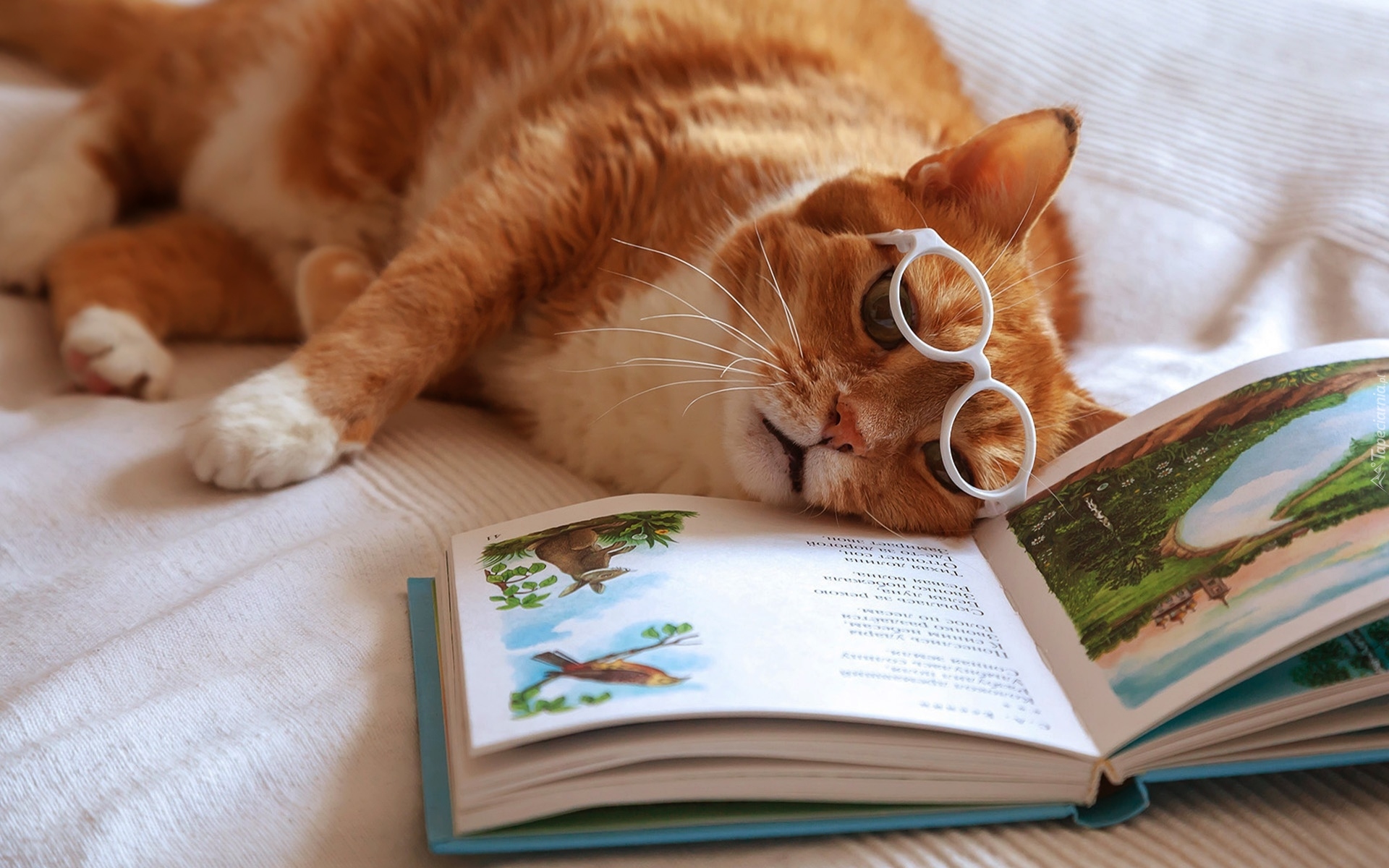 Edytor tapety: Rudy kot w okularach obok książki
