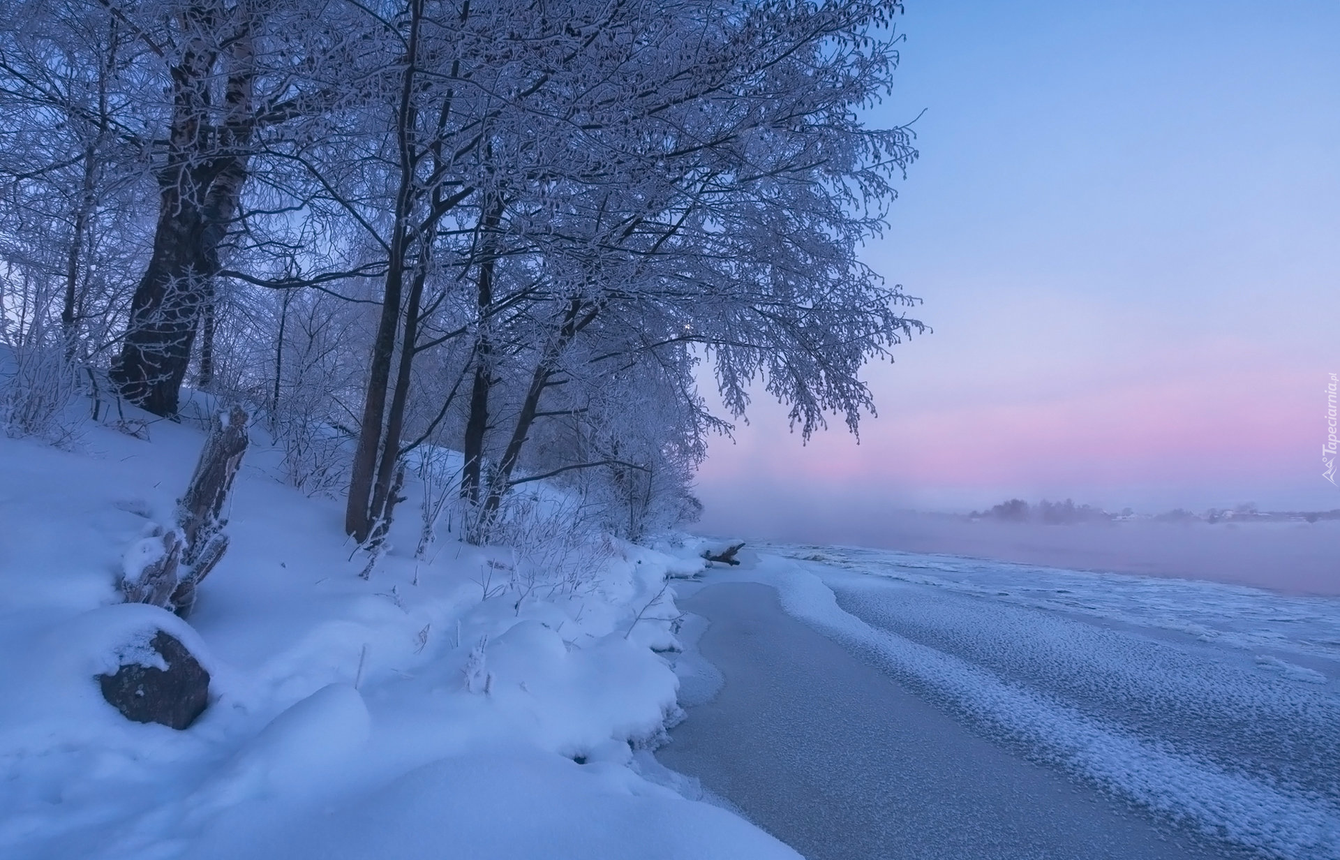 Edytor tapety: Ośnieżone drzewa nad zamgloną rzeką