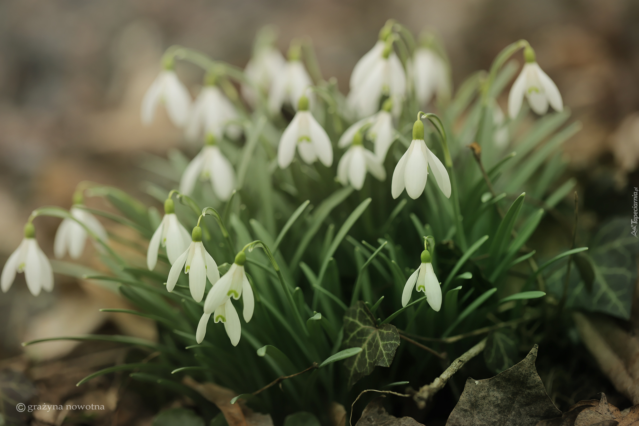 Edytor tapety: Kępka białych przebiśniegów w liściach