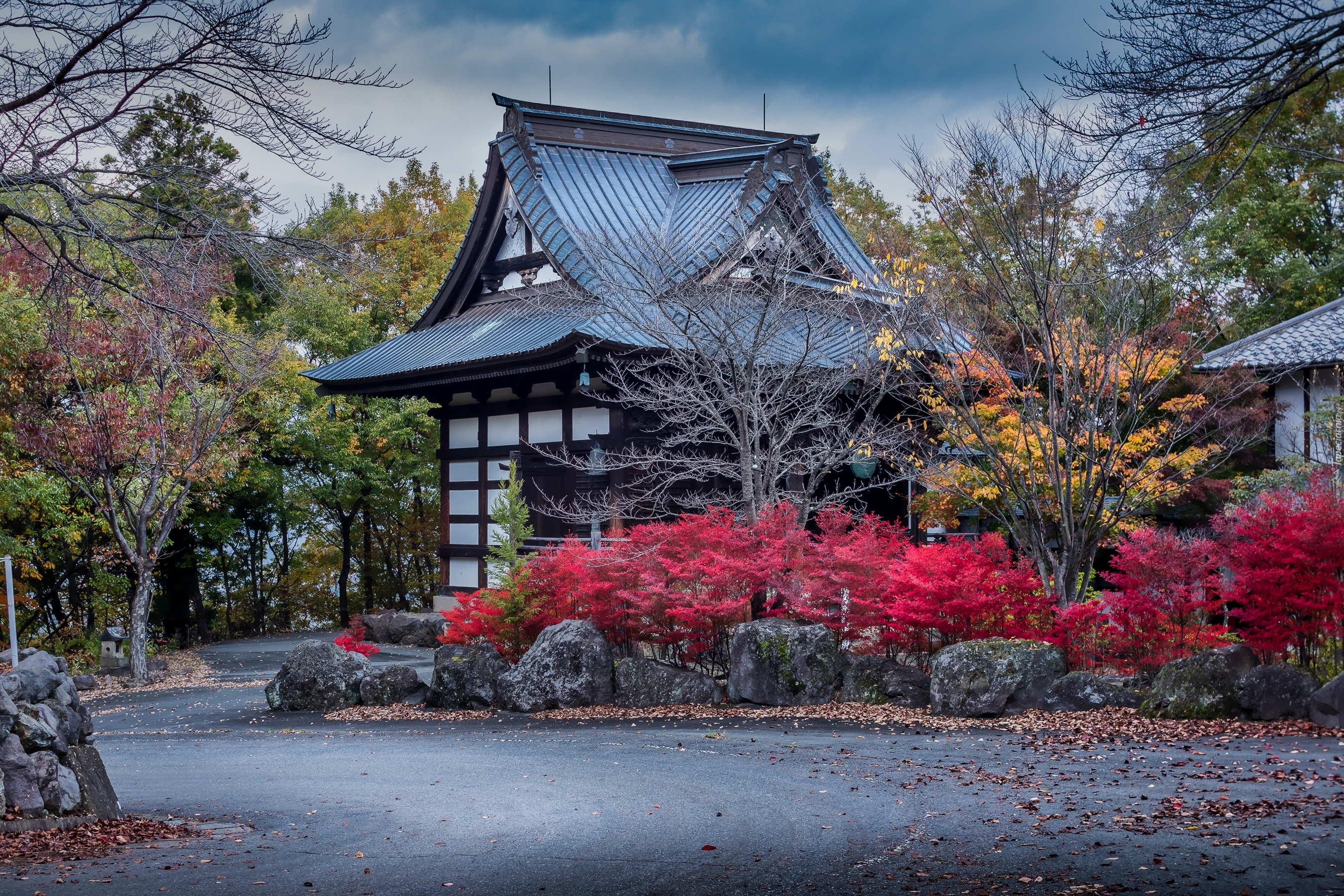 Edytor tapety: Drzewa i krzewy wokół japońskiego domu minka