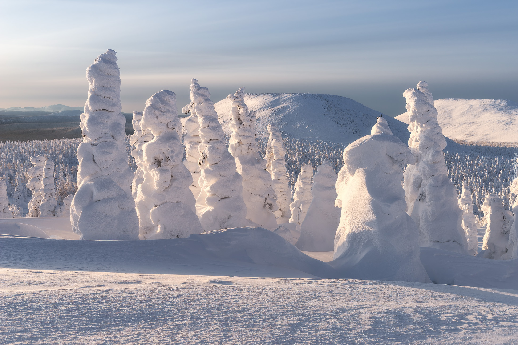 Edytor tapety: Zaśnieżone drzewa w słońcu