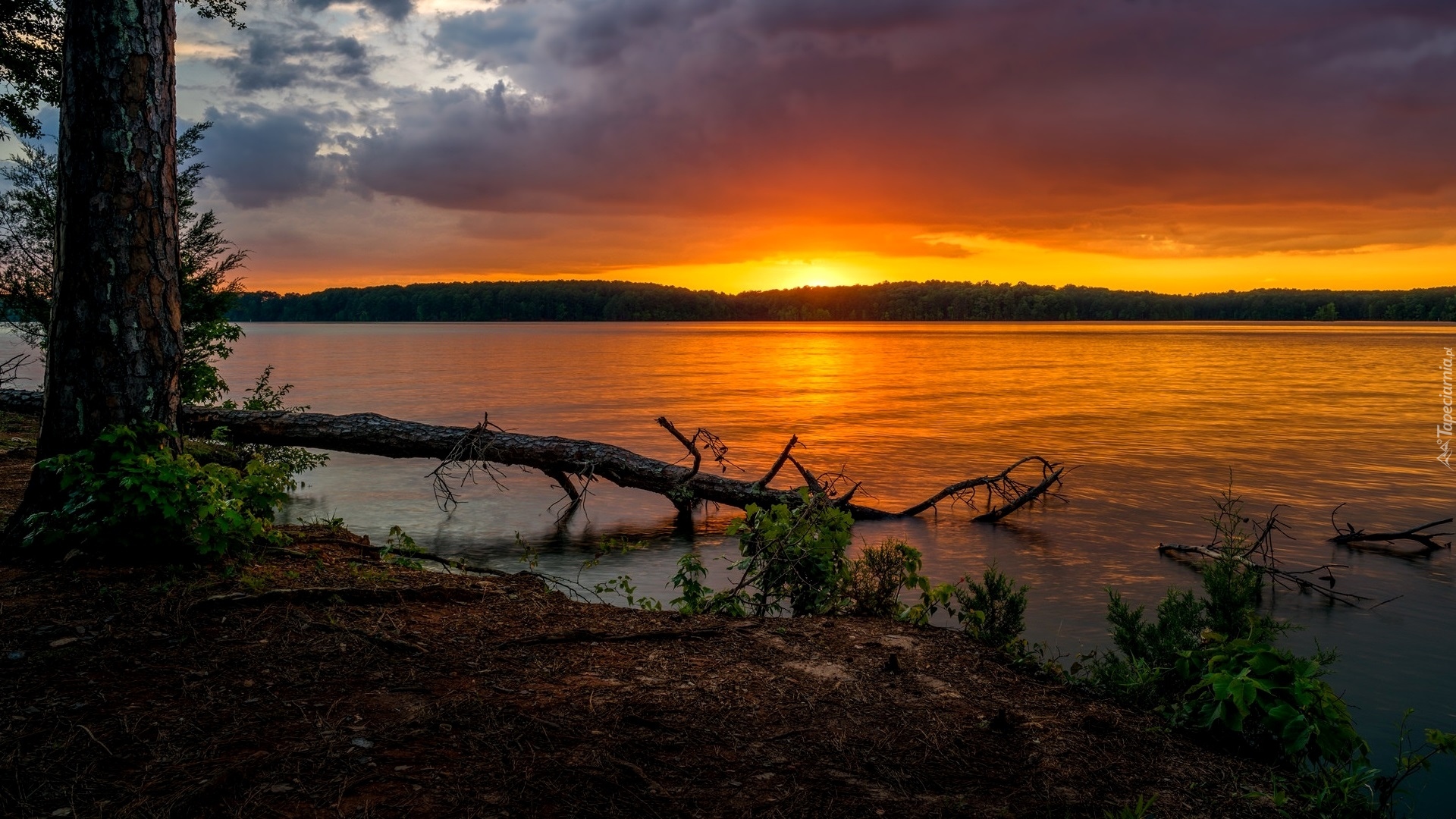 Edytor tapety: Przewrócony pień drzewa w jeziorze