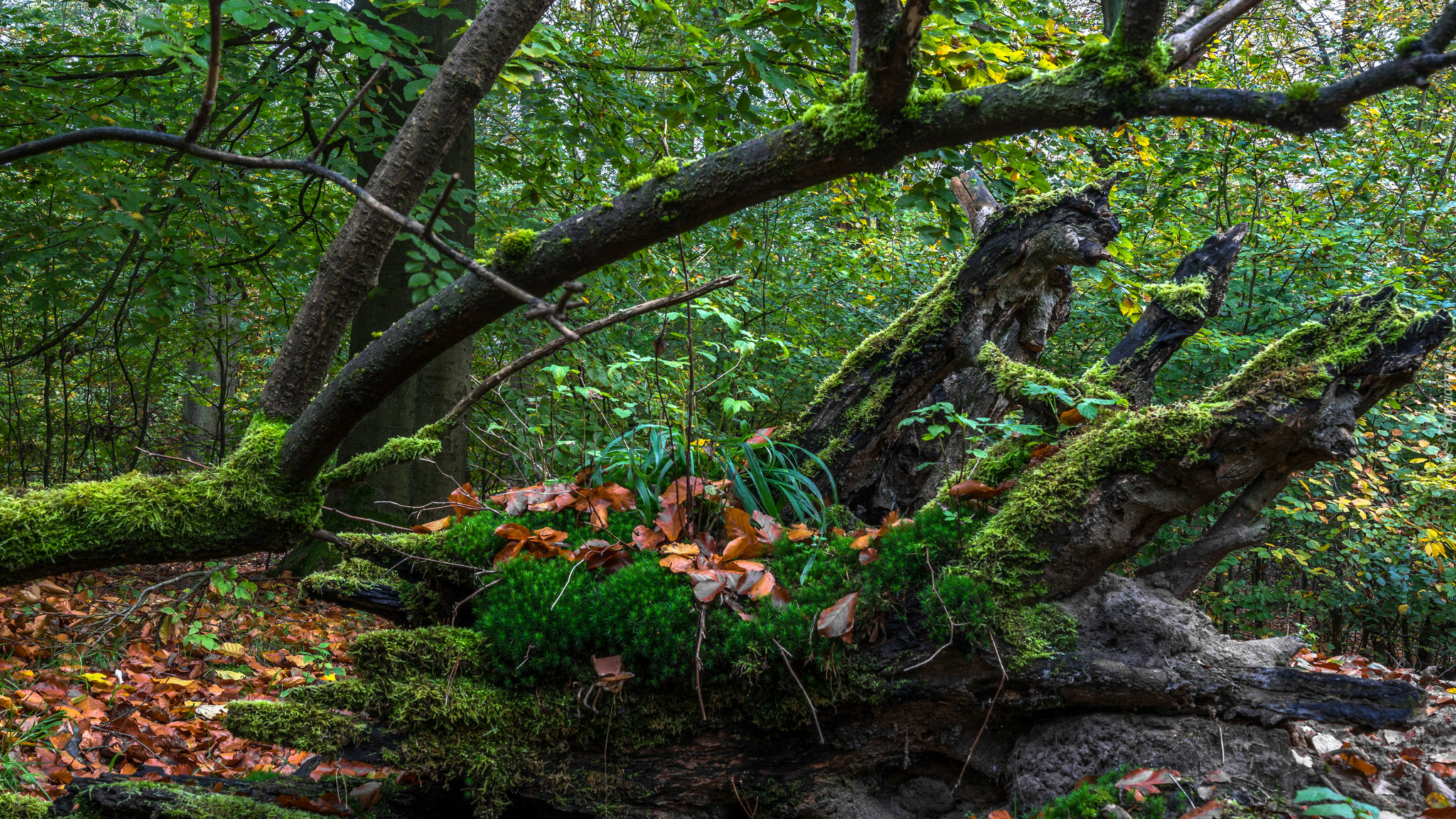 Edytor tapety: Omszałe powalone drzewa w lesie